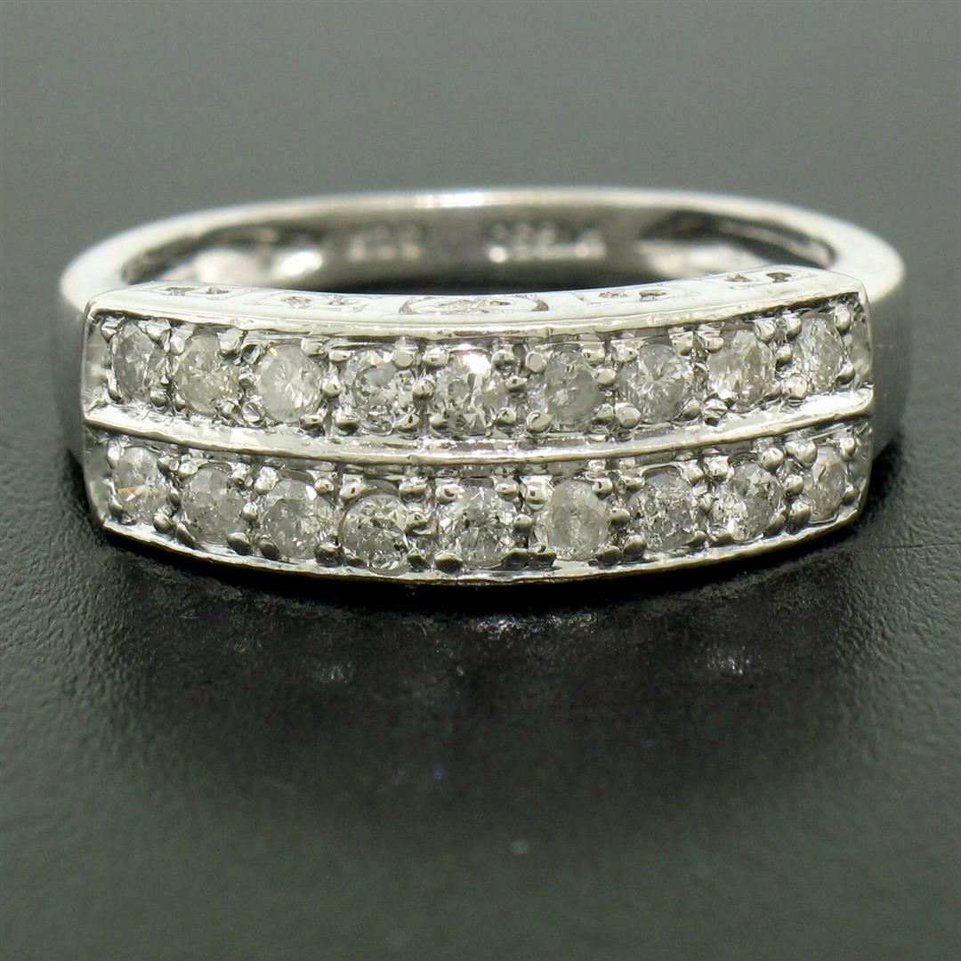 One Vintage .950 Platinum 0.72ctw Dual Row Round Diamond Band Ring w/ Open Gallery. Item Details: Material: Solid .950 Platinum , Weight: 6.2 Grams, Stone(s): (18) Natural Genuine Diamonds - Round Brilliant Cut - Prong Set - F/G Color - I1/I2 Clarity, Total Carat Weight: 0.72 (approx.), Ring Size: 7.5 (We can custom size this ring.), Ring Width: 6.5mm, Ring Height: 4mm rise off the finger, Condition: Vintage ring, excellent condition!