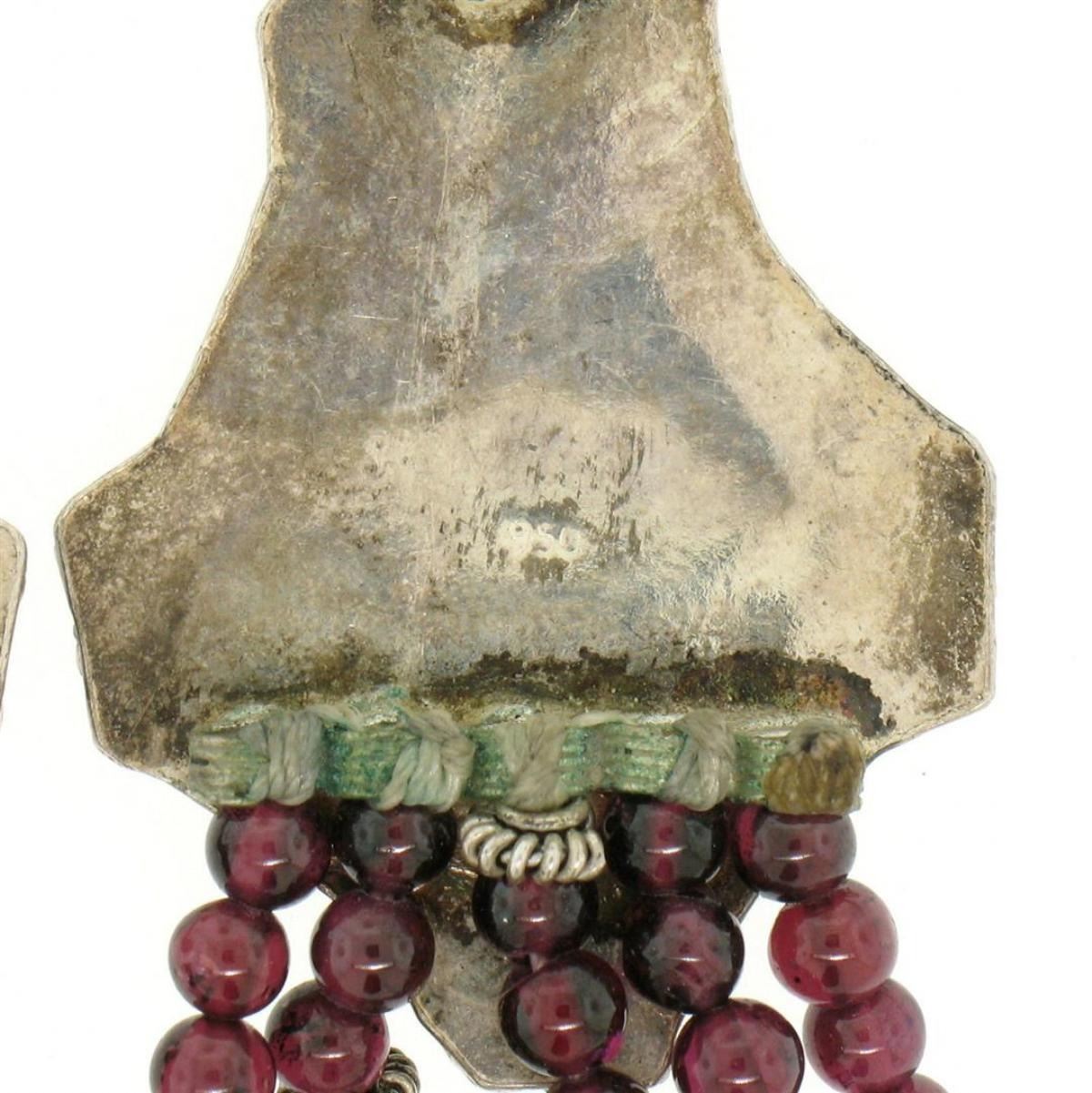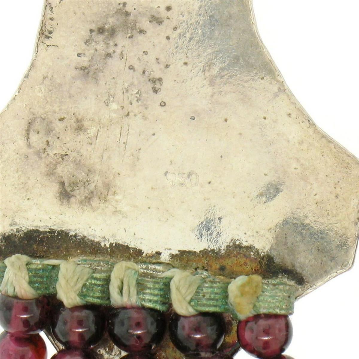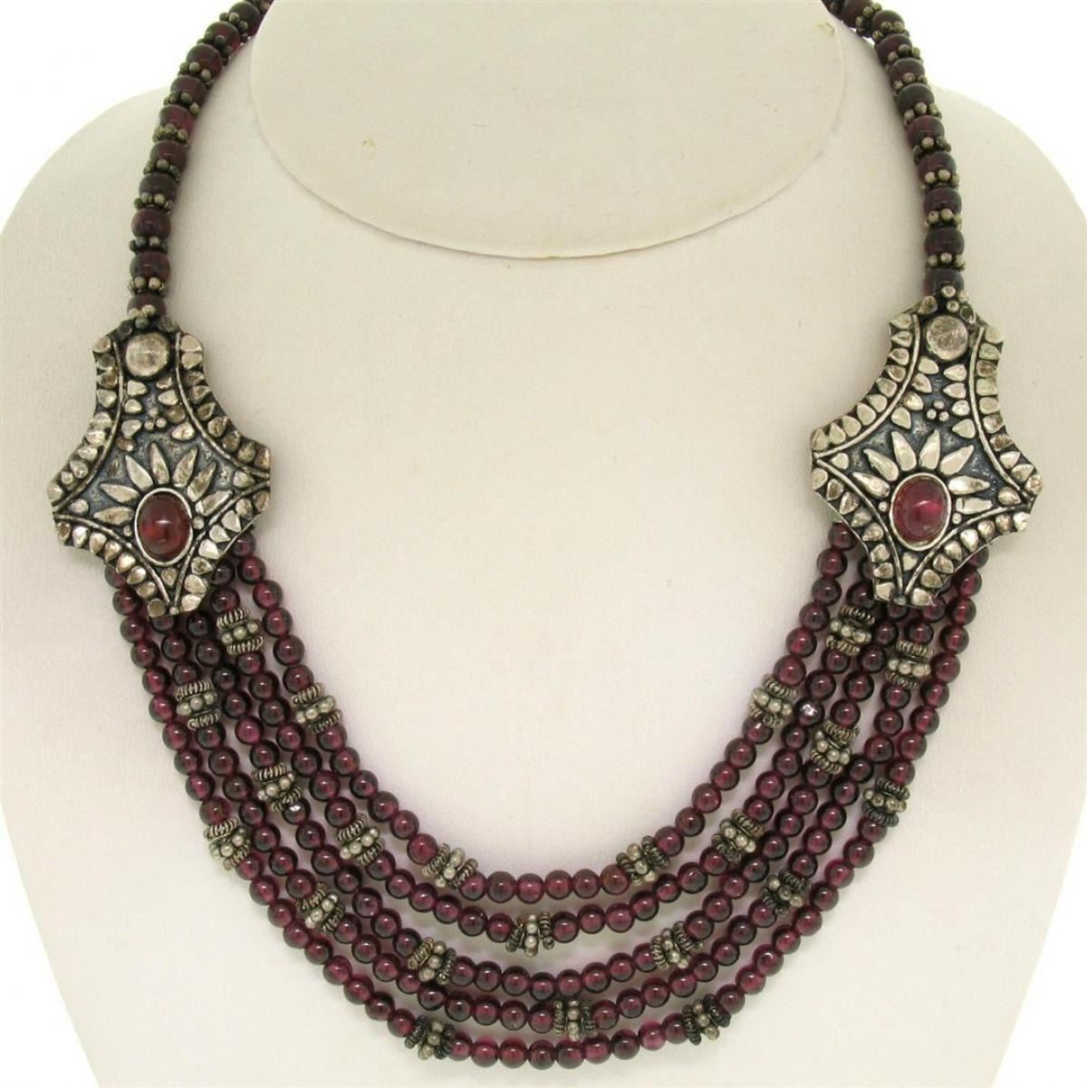 One Vintage .950 Sterling Silver 17" Strung Multi Strand 230 Garnet Bead Necklace. Item Details: Material: Solid .950 Sterling Silver w/ .925 Sterling Silver Clasp, Weight: 63.5 Grams, Stone(s): (2) Natural Genuine Garnet - Oval Cabochon Cut - Bezel Set - Rich Burgundy Color - 8.3x6.4mm (approx.), (230) Natural Genuine Garnet - Spherical Shape - Strung Drilled Beads - Rich Burgundy Color - 3.65 to 4.9mm Diameter (approx.), Chain Type: Multi-Strand String w/ Large Statement Sections and Silver Bead Accents, Chain Length: 17 Inches, Clasp: Lobster Claw, Width: 28.57mm at the statement sections Thickness: 8.86mm at the statement sections Condition: Vintage piece. Shows some signs of tarnish. Excellent overall condition!