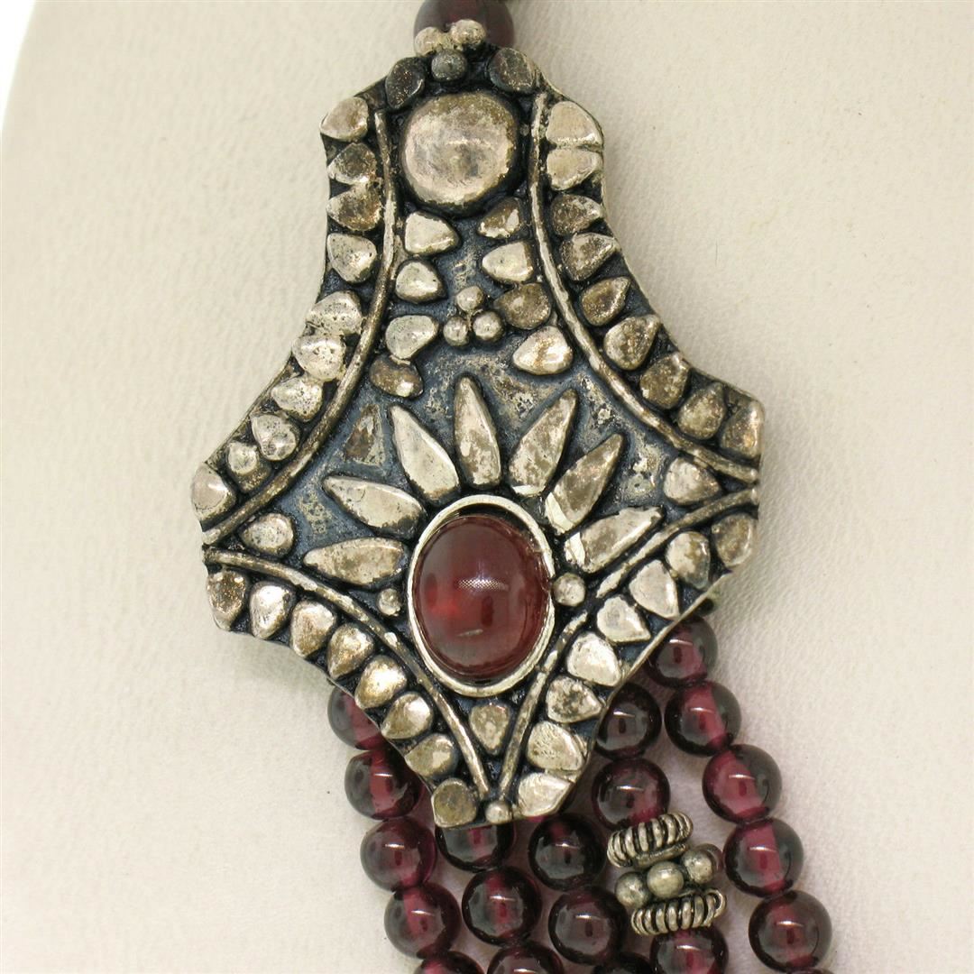 One Vintage .950 Sterling Silver 17" Strung Multi Strand 230 Garnet Bead Necklace. Item Details: Material: Solid .950 Sterling Silver w/ .925 Sterling Silver Clasp, Weight: 63.5 Grams, Stone(s): (2) Natural Genuine Garnet - Oval Cabochon Cut - Bezel Set - Rich Burgundy Color - 8.3x6.4mm (approx.), (230) Natural Genuine Garnet - Spherical Shape - Strung Drilled Beads - Rich Burgundy Color - 3.65 to 4.9mm Diameter (approx.), Chain Type: Multi-Strand String w/ Large Statement Sections and Silver Bead Accents, Chain Length: 17 Inches, Clasp: Lobster Claw, Width: 28.57mm at the statement sections Thickness: 8.86mm at the statement sections Condition: Vintage piece. Shows some signs of tarnish. Excellent overall condition!