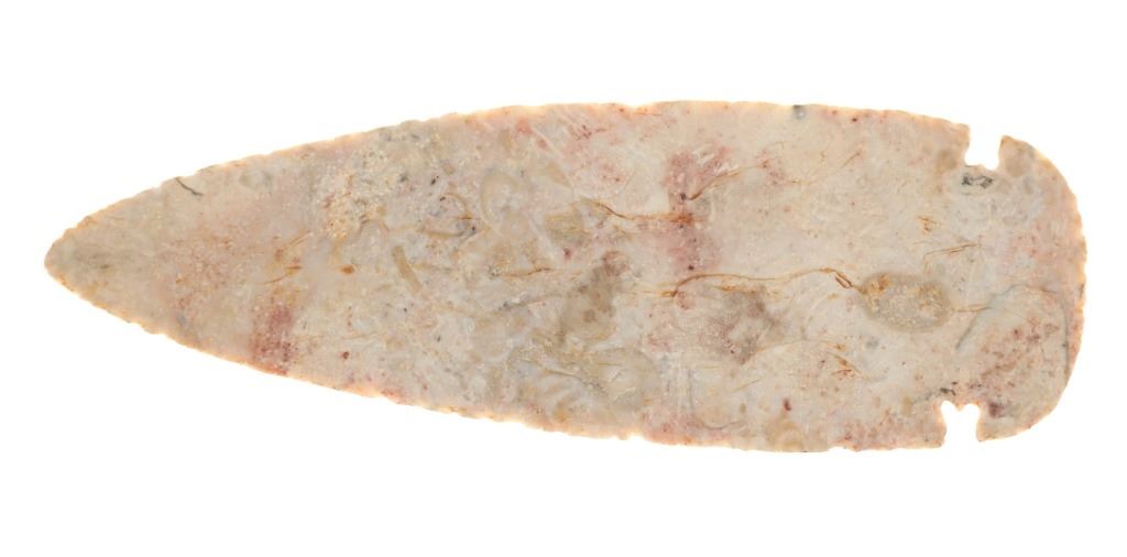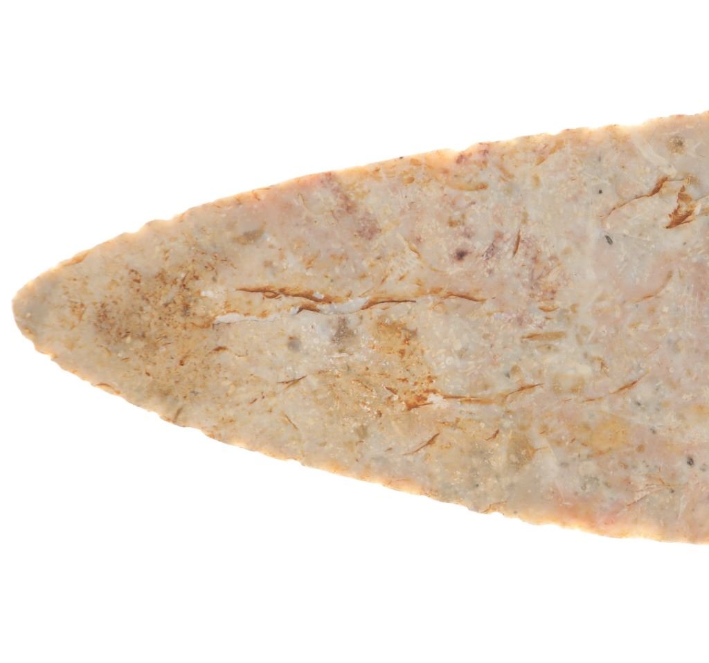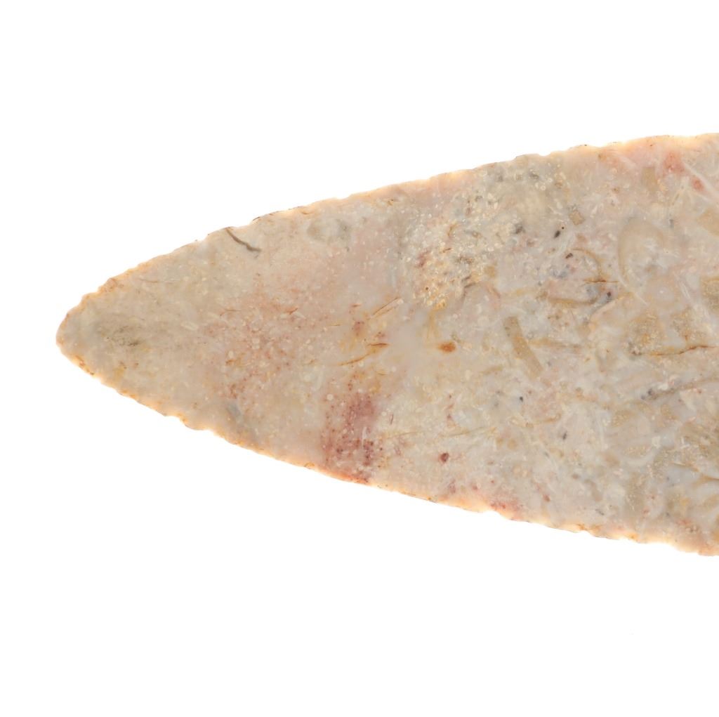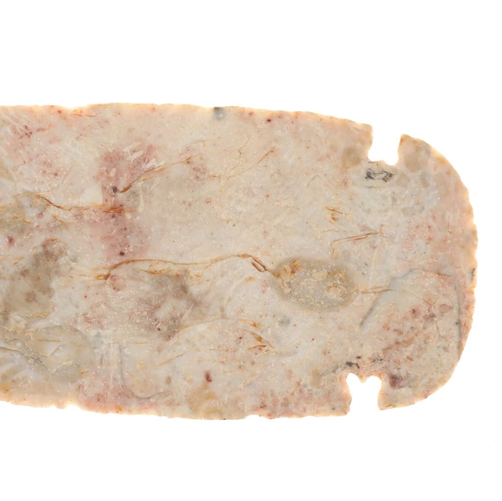 Featured in this lot is a large Kessel side notch cluster point, circa 9500-8500 B.P. The point features a wonderfully and professionally crafted pink Crescent Quarry Flint. construction. The point shows a long lanceolate point that shows serrated edge with side notches with a flared stem and rounded shoulders. The condition of this projectile point is well preserved with no obvious signs of damage and shows well preserved overall condition. The measurements of this point are 7 3/8" x 2 1/2". The collective weight of this point is 4oz.*