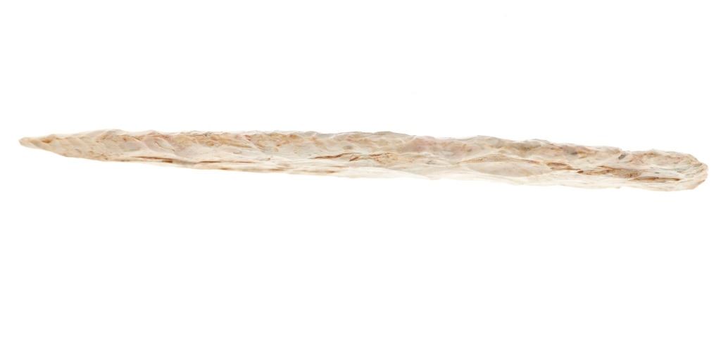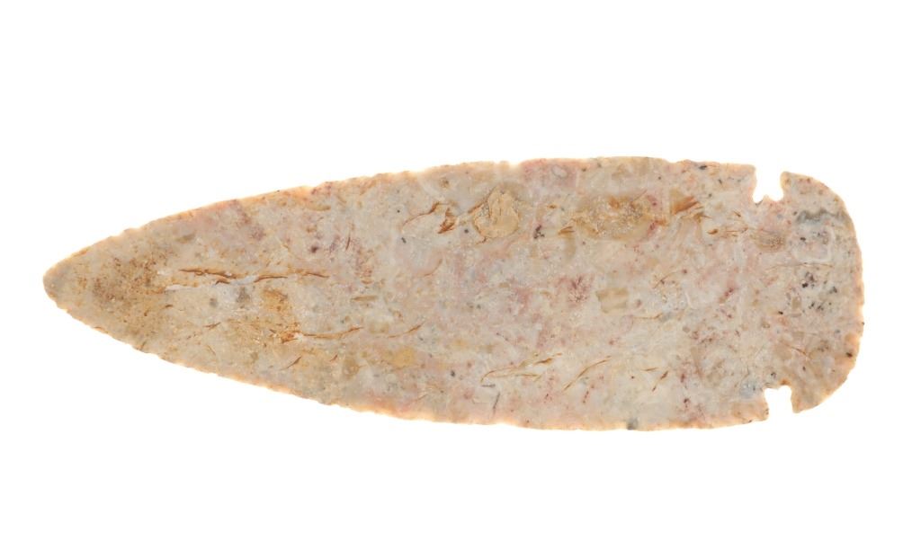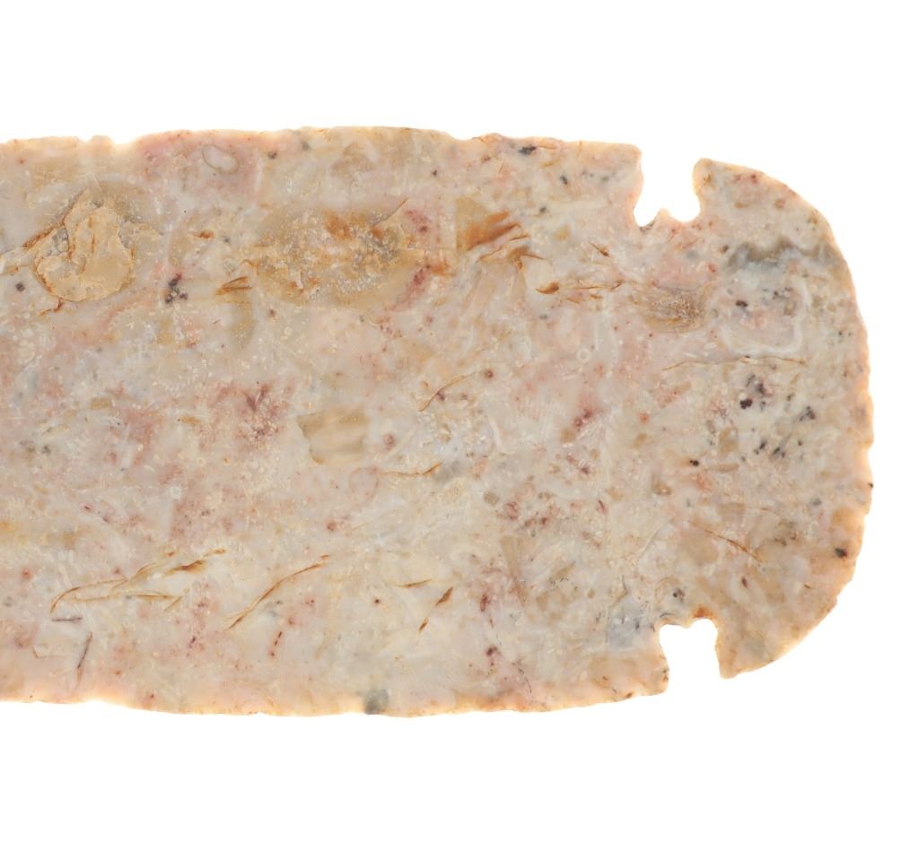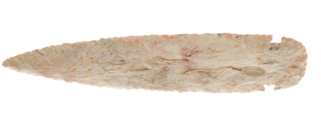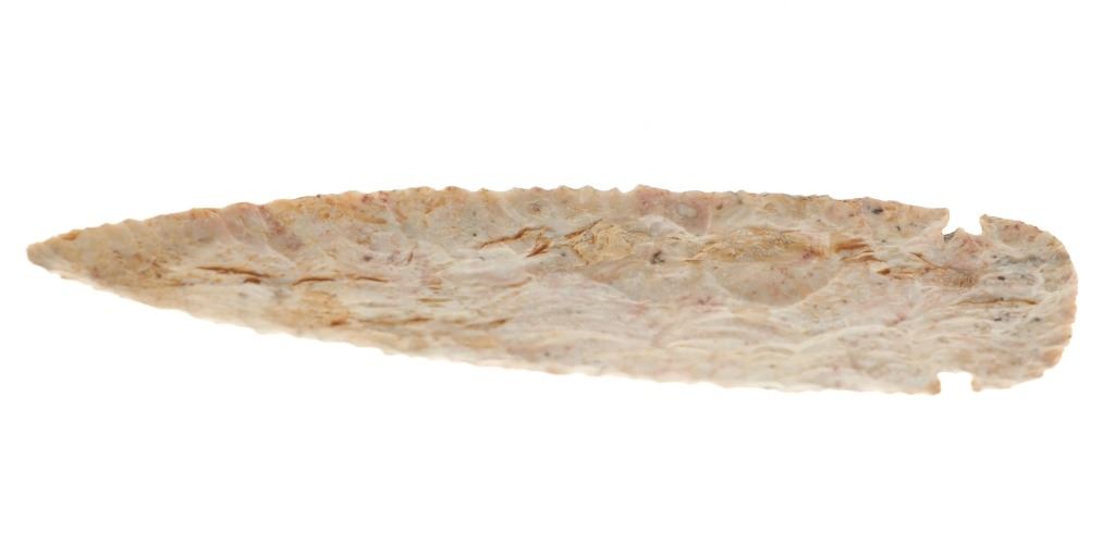 Featured in this lot is a large Kessel side notch cluster point, circa 9500-8500 B.P. The point features a wonderfully and professionally crafted pink Crescent Quarry Flint. construction. The point shows a long lanceolate point that shows serrated edge with side notches with a flared stem and rounded shoulders. The condition of this projectile point is well preserved with no obvious signs of damage and shows well preserved overall condition. The measurements of this point are 7 3/8" x 2 1/2". The collective weight of this point is 4oz.*