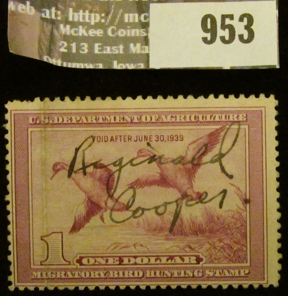 953 _ 1938 RW # 5, One Dollar U.S. Department of Agriculture Migratory Bird Hunting Stamp, signed.