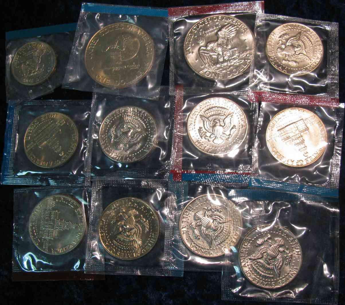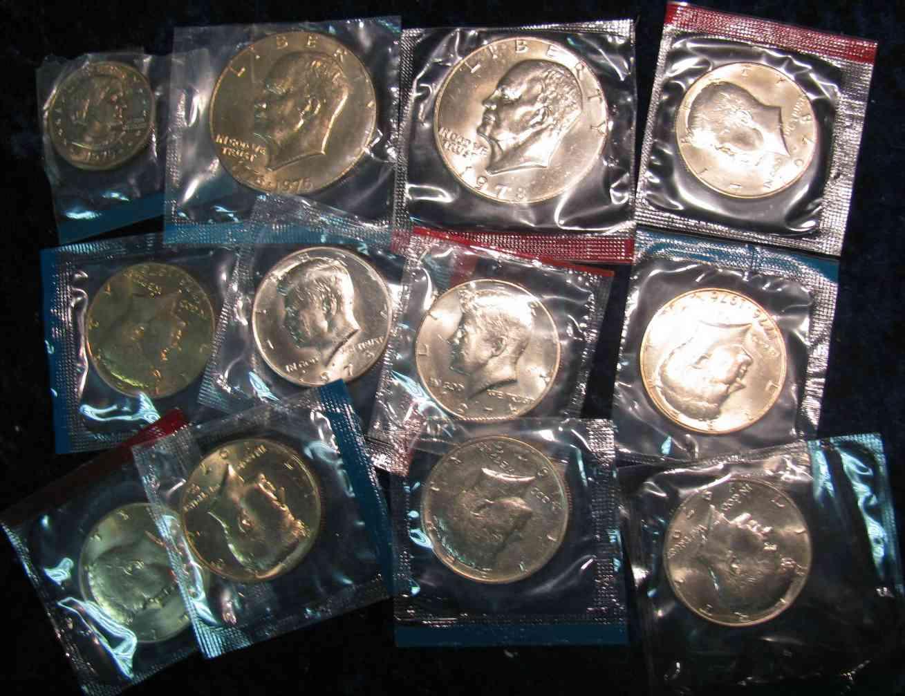 959. 1976P T1, 78D & 79P Dollars & (9) Clad Kennedy Halves in Mint celophane.