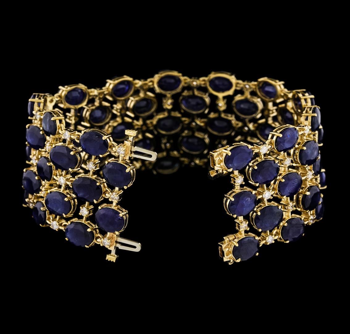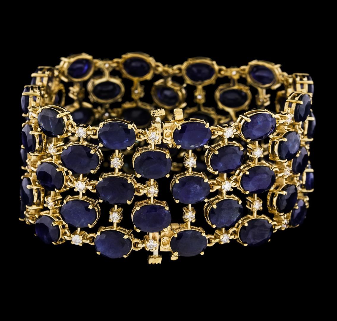 One electronically tested 14KT yellow gold lady's combination cast & assembled fashion bracelet with a double tongue clasp with foldover safeties with a bright polish finish. The featured lady's bracelet has five connected rows of alternating sapphires and diamonds and measures approximately 7 inches in length. Condition is new, good workmanship. Containing: Sixty prong set oval modified mixed cut natural blue sapphires, measuring 8.00 x 6.05 x 3.80mm, (depth est.) 3%. bulge factor, approximate total weight of 96.01ct., clarity is severely included, medium dark, very slightly grayish, blue color, (GIA B 6/3), cut is good. Transmitting light somewhat diffusely, semi-transparent to translucent. Naturally occurring internal & external characteristics are present. Indications of laboratory high temperature heat treatment. Colored gemstones are presumed to have been subjected to commonly used enhancement processes. Graded in the setting. Sixty prong set round brilliant cut diamonds, measuring 2.30 - 2.25 x 1.41mm (depth est.) approximate total weight of 60 Stones = 2.69ct. Graded in the setting. Clarity SI-1 to I-1. Color: H - J Cut Good. Total Weight of Colored Stones 96.01ct.. Total Weight of Diamonds 2.69ct.. Total Weight of Bracelet 61.90gm. GAS Appraised at $19,705.00.
