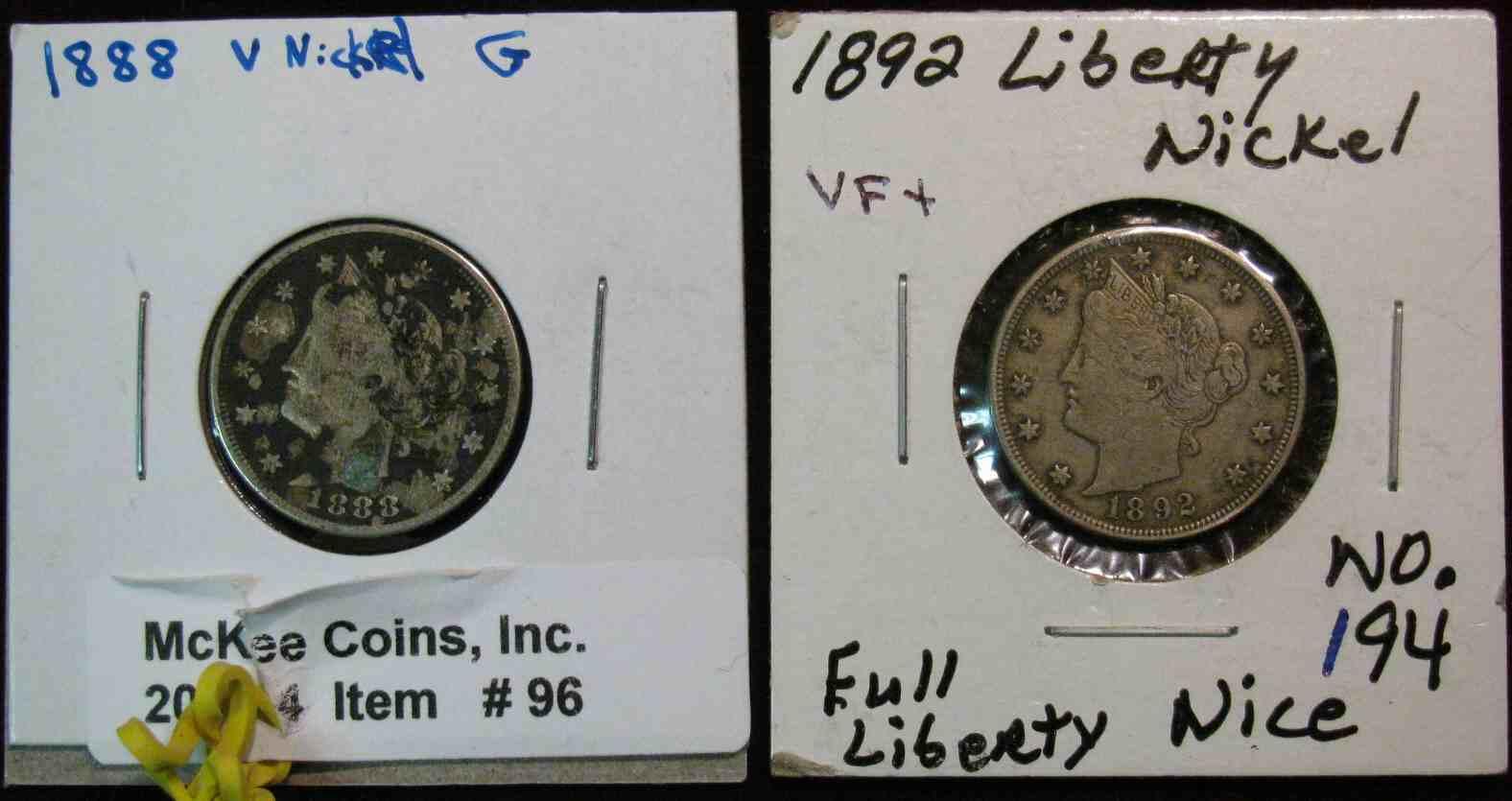 96. 1888 Damaged & 1892 VF Liberty Nickels.