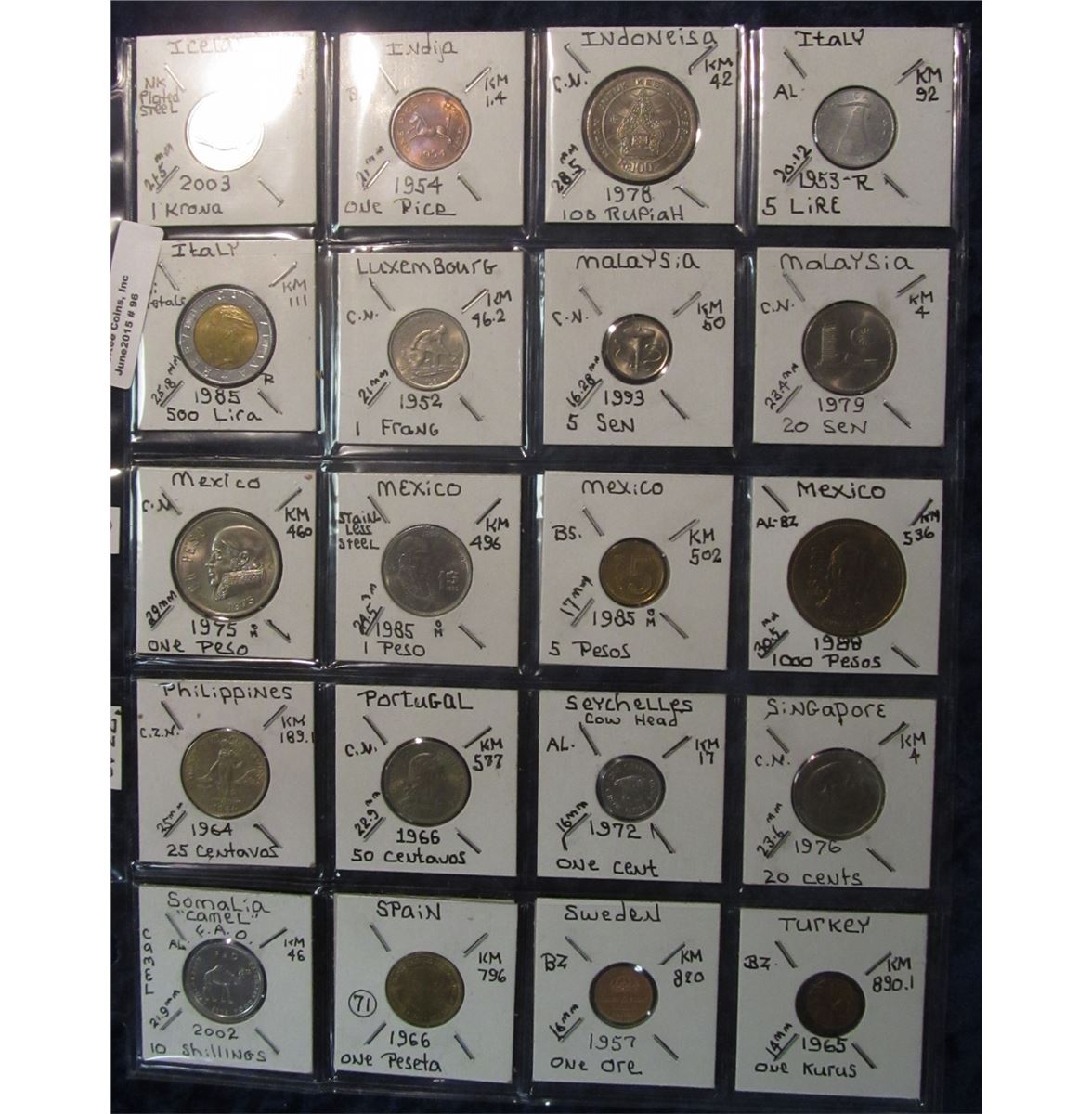 96. (20) World Coins in Uncirculated Condition in a Plastic Page identified with KM No., Metal size, & etc. All different. Includes: Iceland, India, Indonesia, Italy, Luxembourg, Malaysia, Mexico, Philippines, Portugal, Seychelles, Singapore, Somalia, Spain, Sweden, & Turkey. KM Value on this group is $33.40.