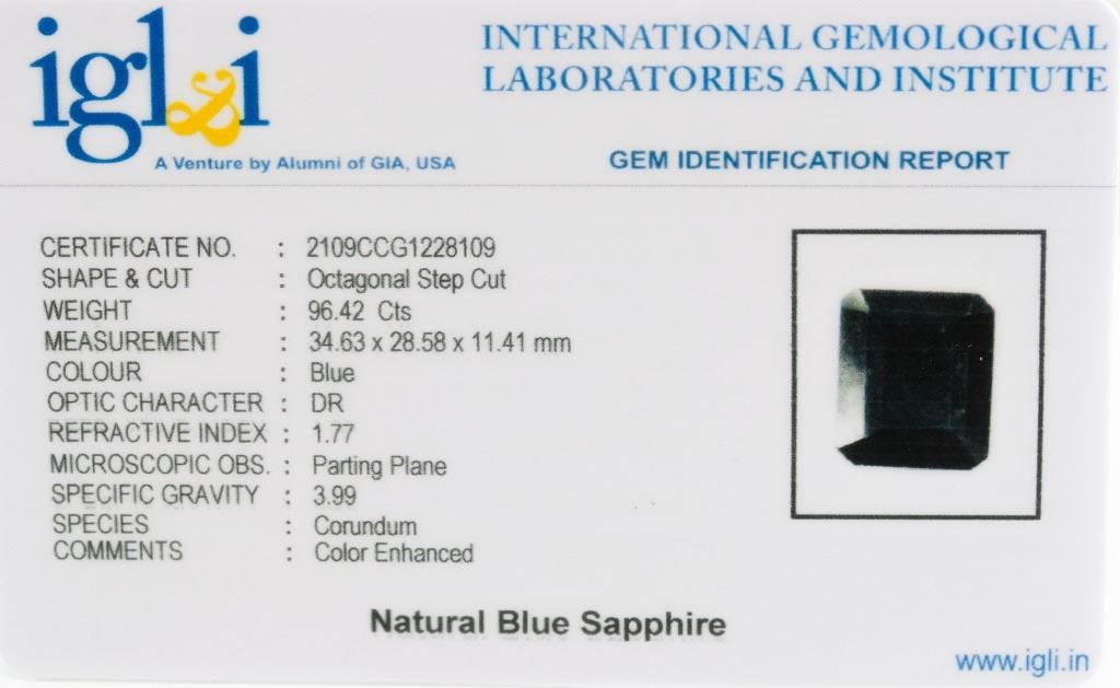 96.42 ct octagonal step cut blue natural sapphire. Accompanied with IGL&I certificate. 34.63 x 28.58 x 11.41 mm.