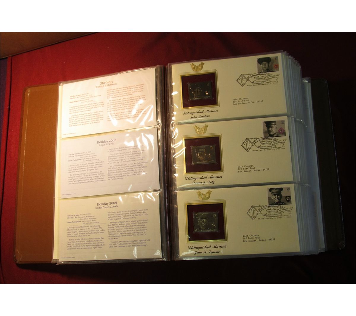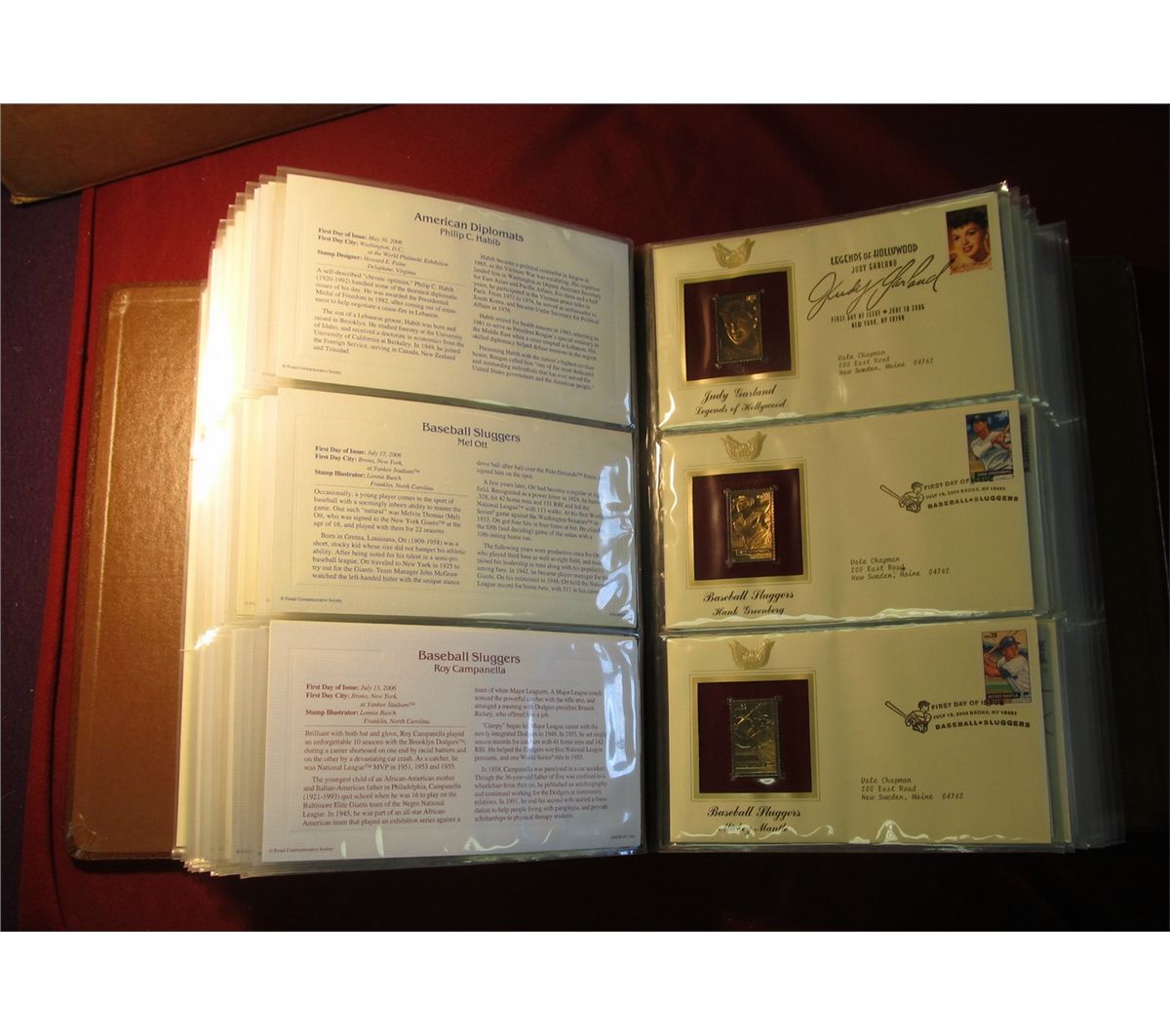 96. Large simulated Leather bound album "Golden Replicas of United States Stamps proof replicas on a gleaming surface of 22KT Gold". Includes dozens of Stamped covers with 22 KT Gold Stamps.