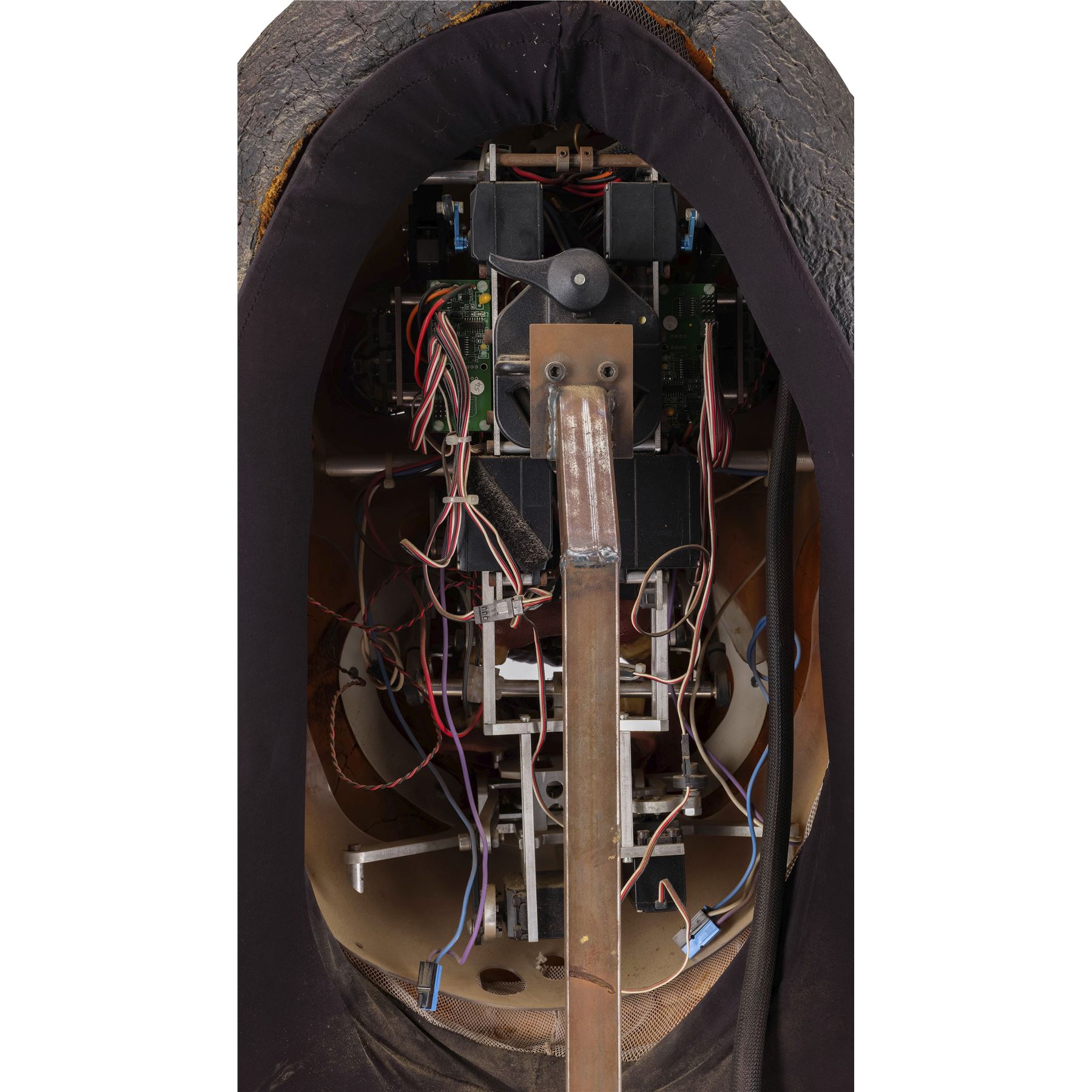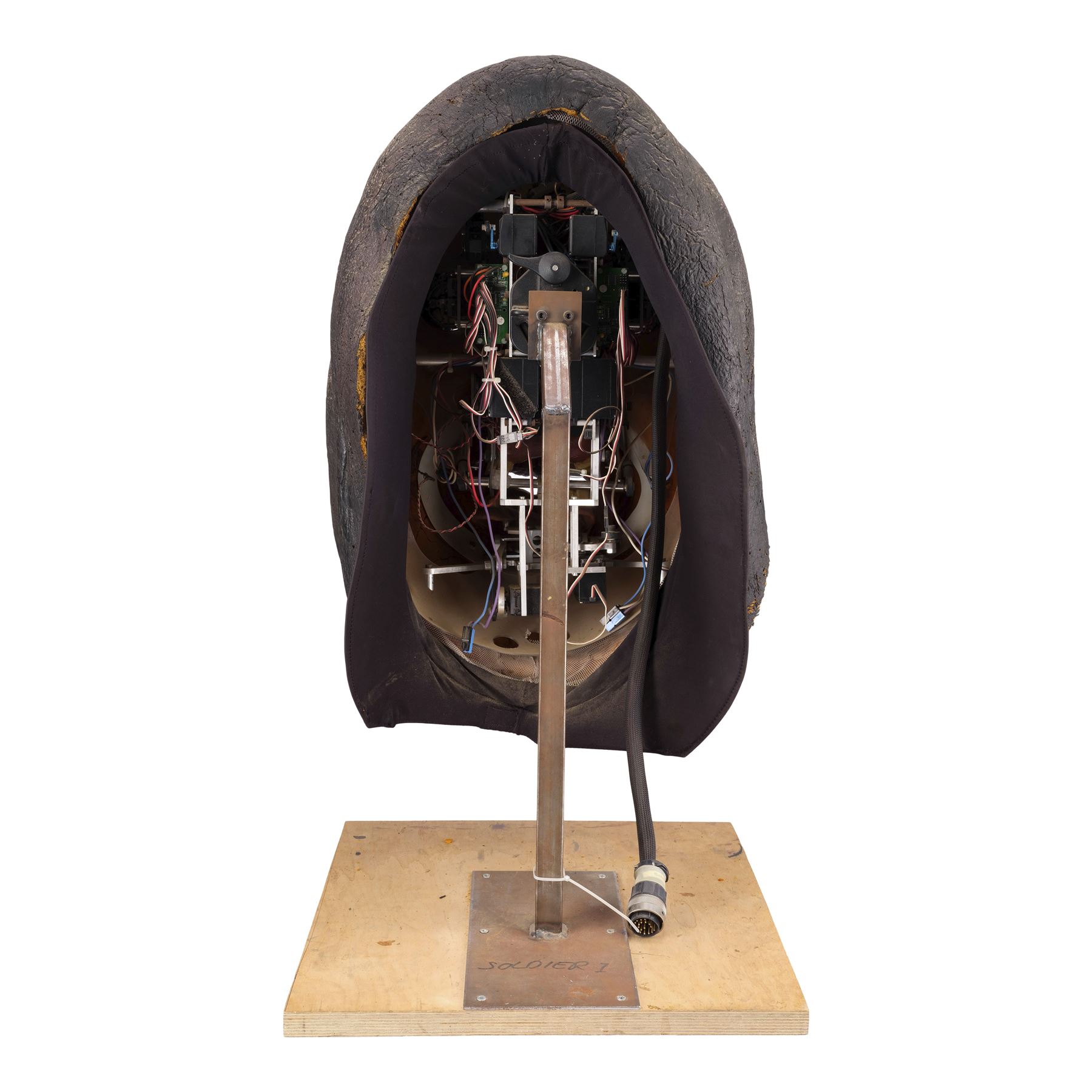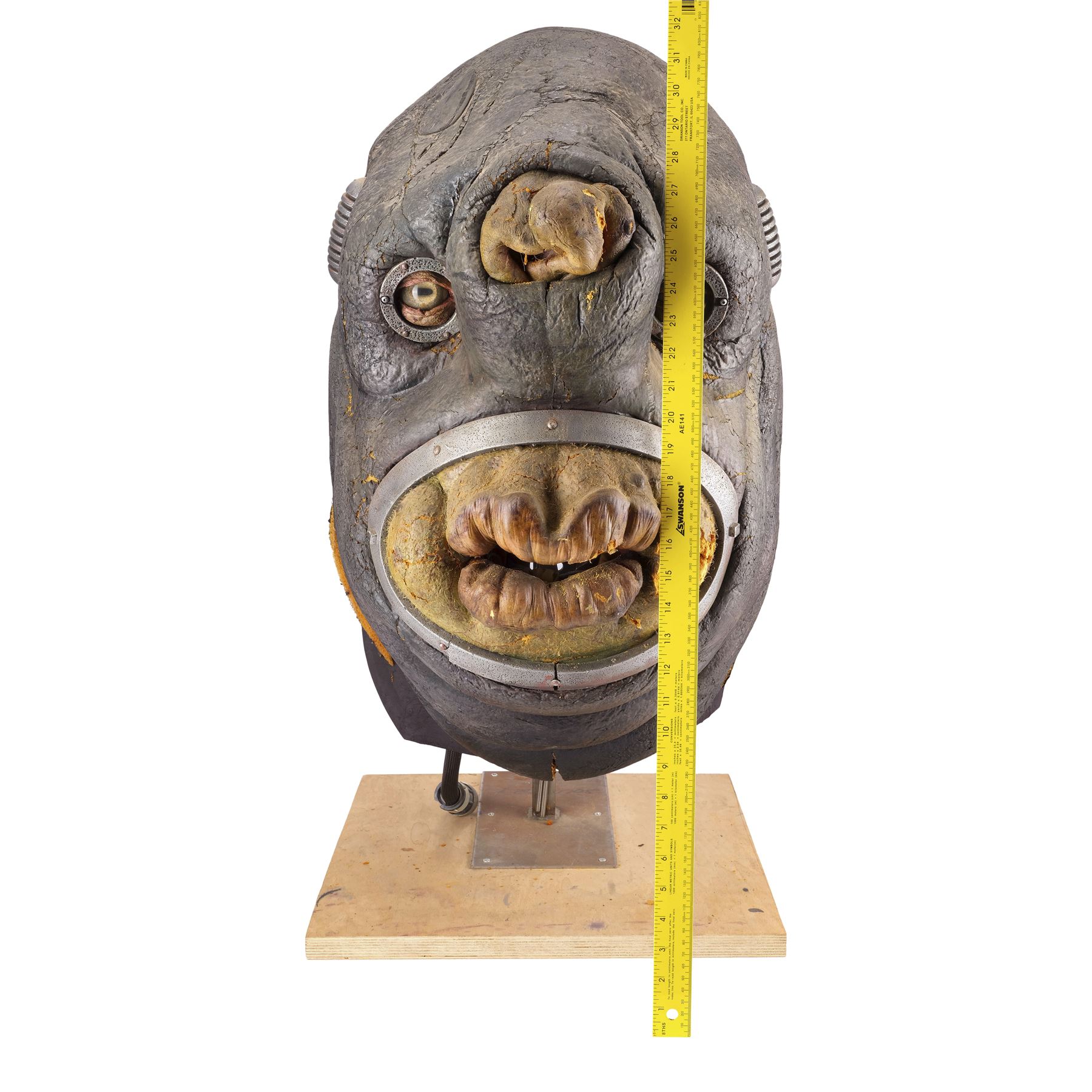 Created by the Jim Henson Creature Shop, this hand-painted green and purple plastic and foam latex Vogon head with inset glass eyes, hand-punched hair, and faux steel clamps around its mouth and temples contains a fabric-wrapped metal interior structure built to house mechanical and animatronic components, including a thick black power cable running through the neck. The head comes mounted via a metal stand to a wooden base hand-marked "Soldier 1." It exhibits splitting foam throughout from production use and age as well as missing chunks of foam on the left cheek, lips, and forehead, and its current functionality remains untested. Dimensions: 17.5" x 26" x 33" (44.5 cm x 66 cm x 84 cm)