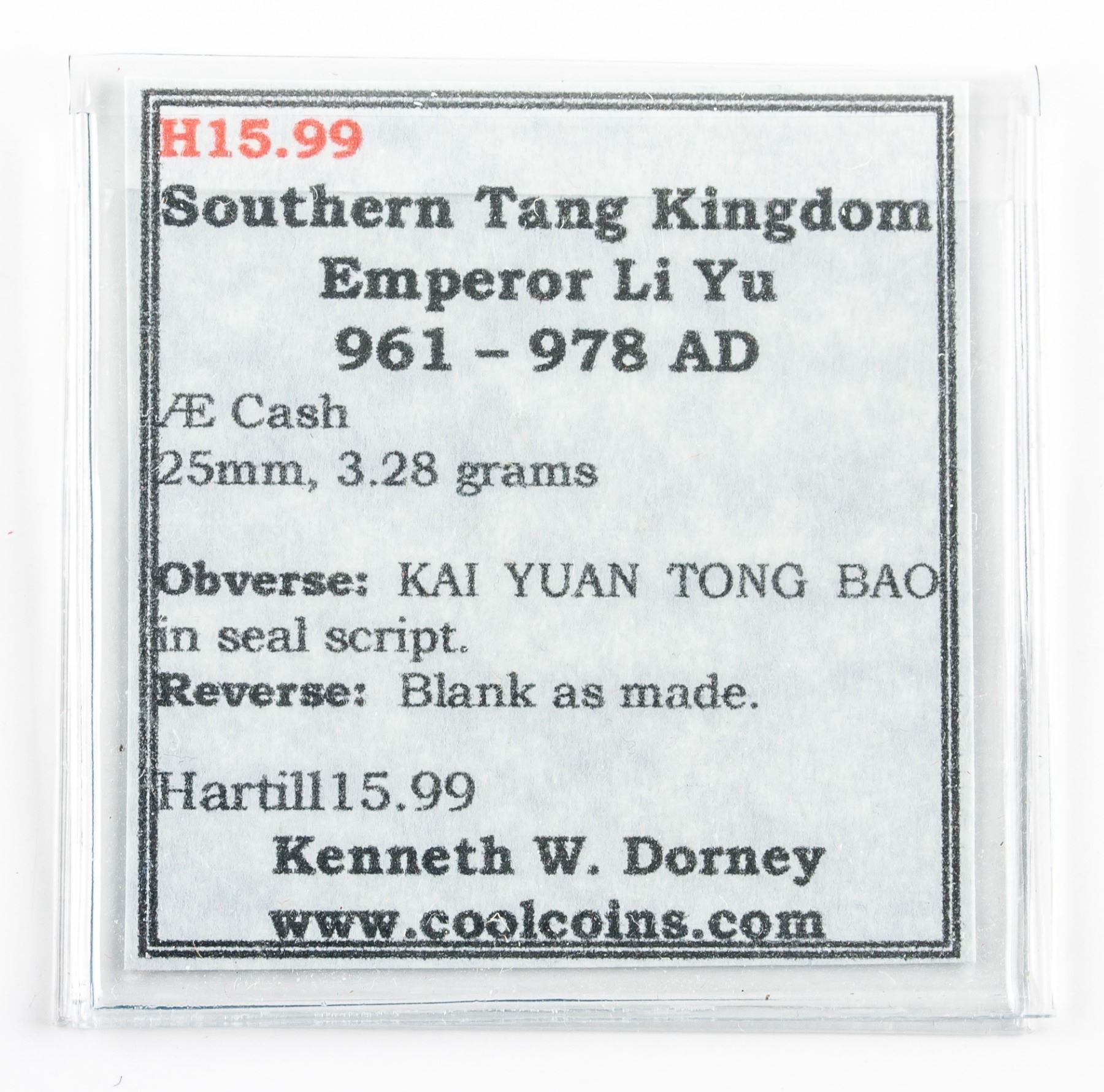 961-978 Chinese Southern Tang Kingdom 1 Cash bronze coin, obverse lettering Kai Yuan Tong Bao in seal script, Hartill 15.99, D: 25 mm, 3.28 grams