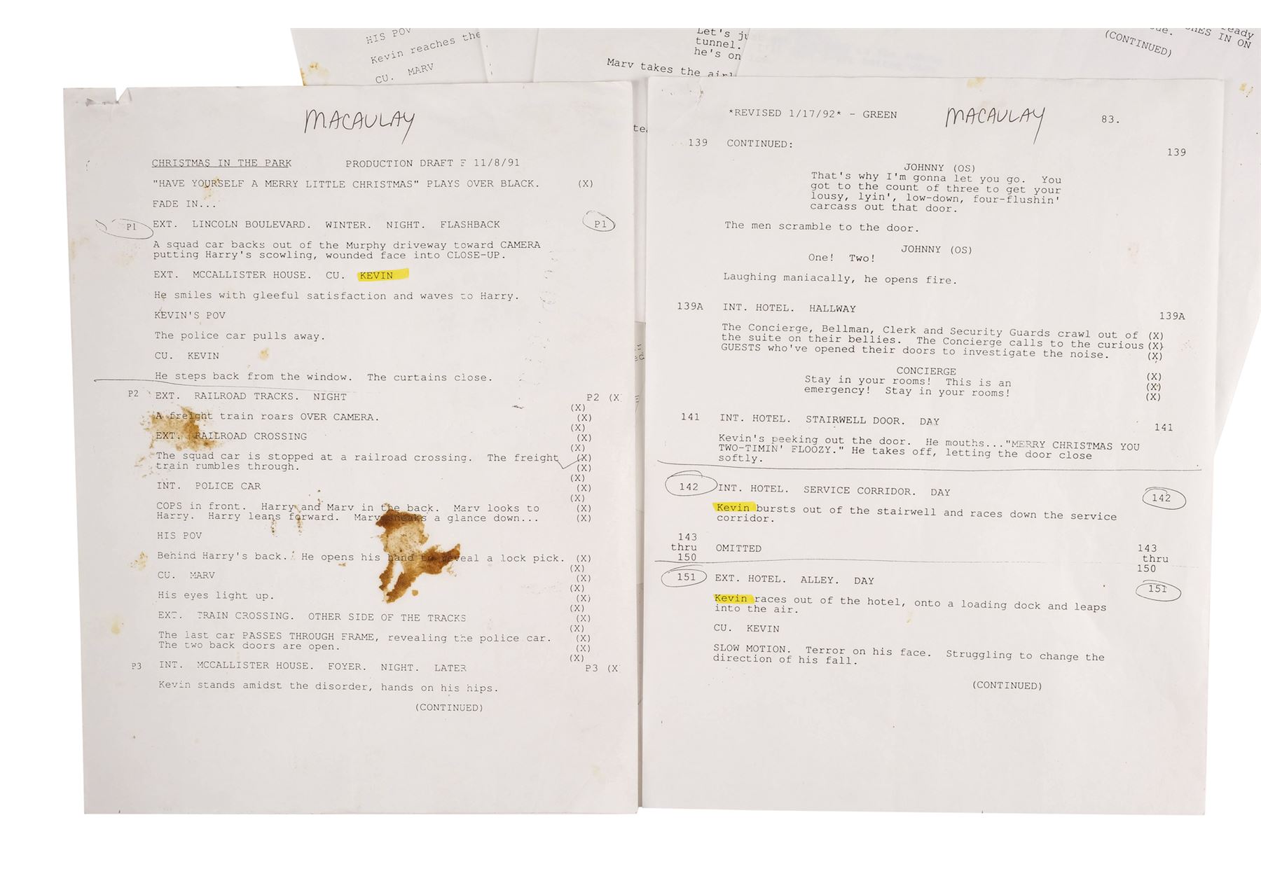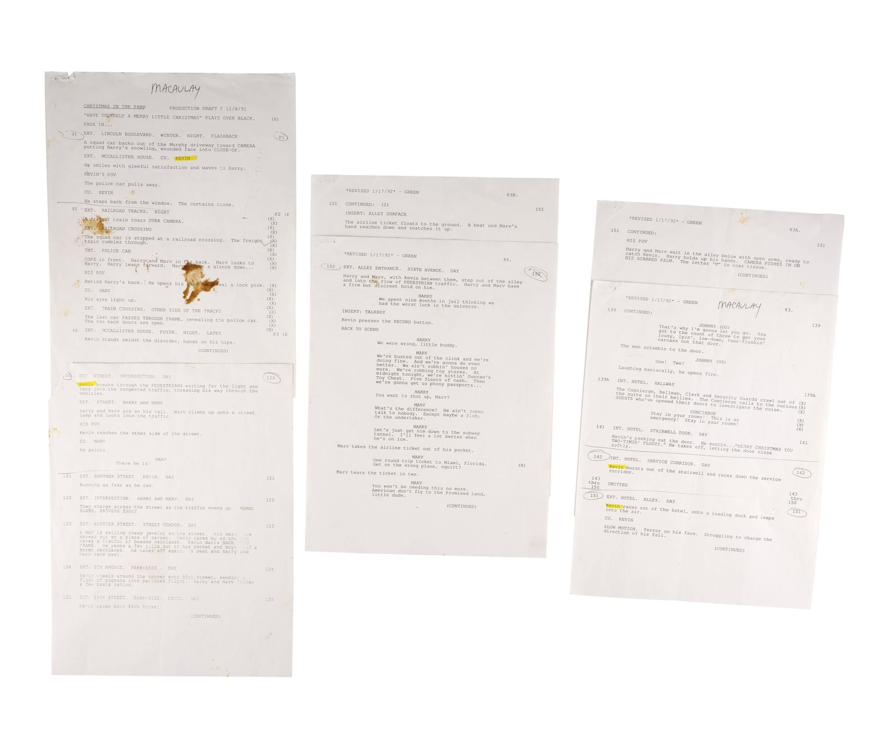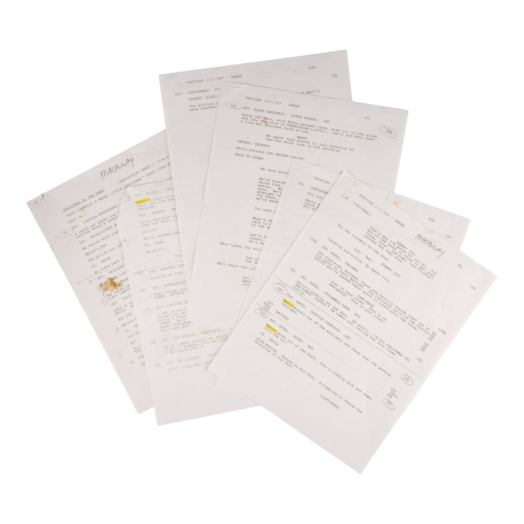 HOME ALONE 2: LOST IN NEW YORK (1992) - Set of Six Hand-Marked and Annotated Macaulay Culkin Script Pages - Six hand-marked and annotated script pages from the production of Chris Columbus' Home Alone 2: Lost in New York labeled for star Macaulay Culkin. Believed to have been photocopied in black-and-white as production sides for the sequence where Harry Lime (Joe Pesci) and Marv Murchins (Daniel Stern) chase Kevin McCallister (Culkin) into an alley, these pages originated from two different drafts of John Hughes' script: the production draft dated "11/8/91" and the green revised draft dated "1/17/92."