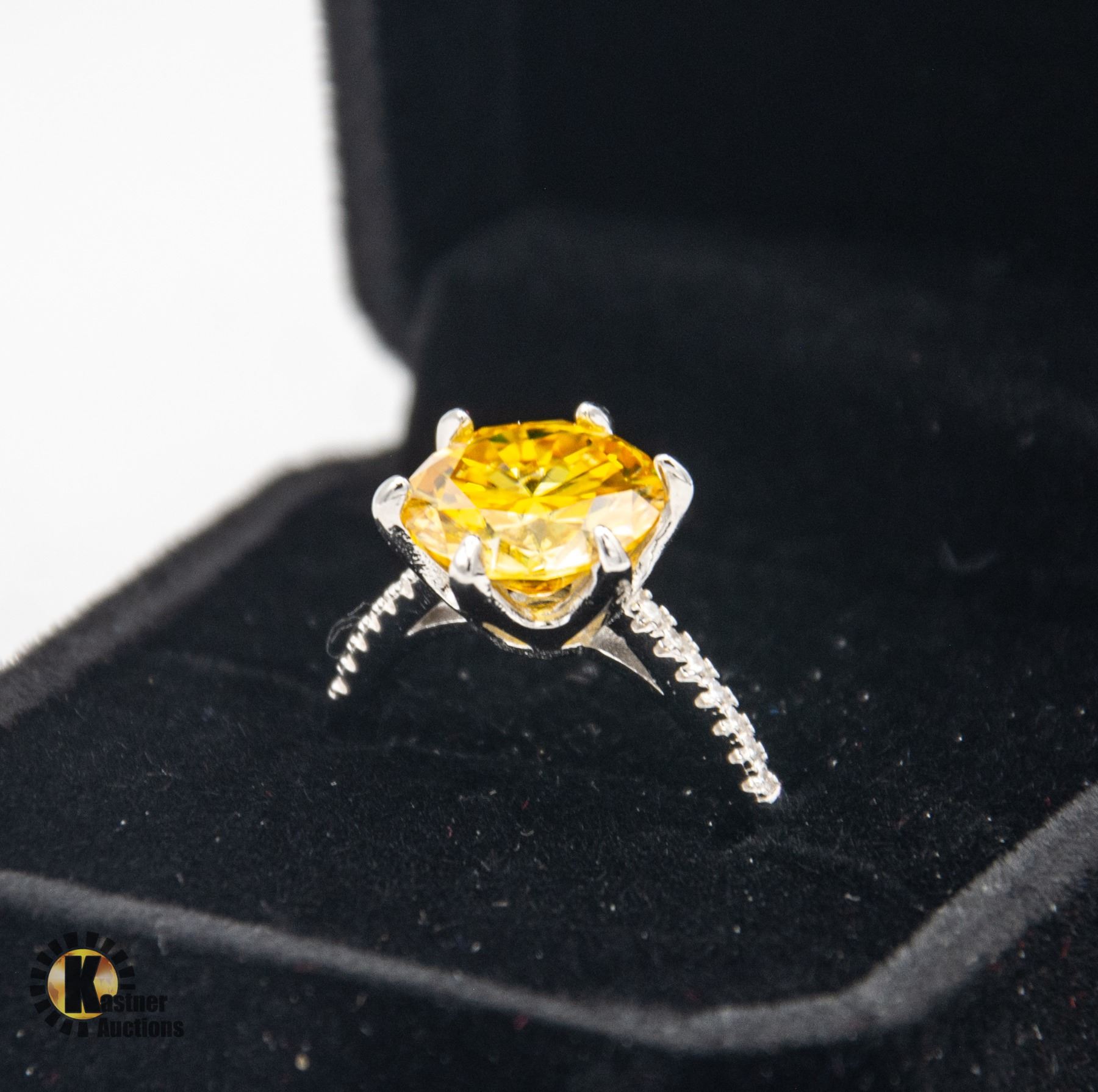 MOISSANITE STONE VVS GOLDEN YELLOW COLOR SET IN CENTER OF 6 CLAW HEAD SET IN 925 SILVER RING SIZE 8 **ALL ITEMS MUST BE REMOVED BY 5PM SATURDAY, NOVEMBER 16TH 2024. ALL REMAINING ITEMS WILL BE SUBJECT TO A $6.00 PER DAY STORAGE CHARGE. ANY ITEMS REMAINING AFTER MONDAY, DECEMBER 2ND 2024 WILL BE CONSIDERED FORFEITED. NO REFUNDS WILL BE ISSUED FOR FORFEITED ITEMS. TO SCHEDULE A PICK UP APPOINTMENT CLICK HERE