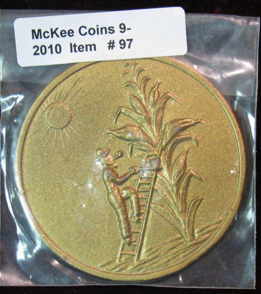 97. Iowa Tall Corn Medal. Depicts a farmer using a ladder to get to the ears. Brass. 62mm.