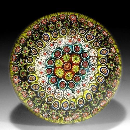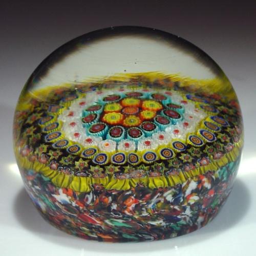 Italian large concentric millefiori paperweight, containing assorted complex canes, in yellow, red, orange, blue, white, and black, over a layer of multi-colored crushed glass. Diameter 3 5/8". NO RESERVE