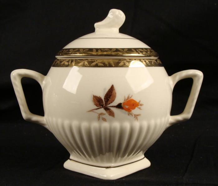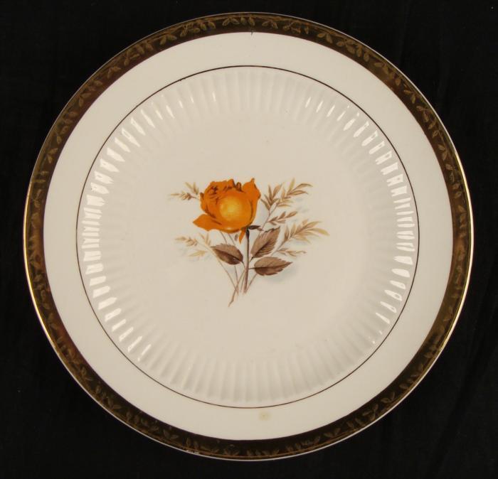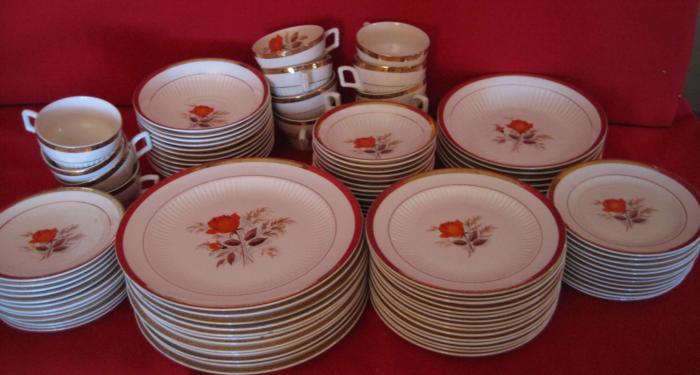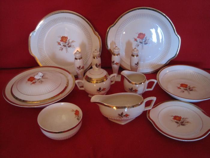 11 1/2" serving plate (some crazing and wear)11 1/2" serving plate with large handles (x2)9" serving bowl9 5/8" covered vegetable4 7/8" bowl5" creamer5 1/2" sugar7 1/2" gravy5 1/2" salt and pepper shakers (x4) (one with a corner chip on the base)There are 12 of each of these: