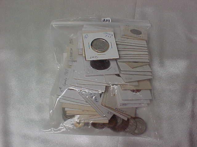 97 World Coins, many in 2x2, includes 1740 Half Penny Bent, some silver, over 50% Canada