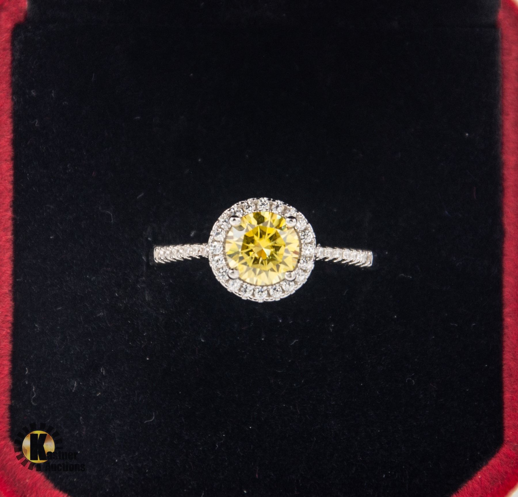 ROUND BRILLIANT CUT MOISSANITE STONE VVS LEMON YELLOW COLOR SET IN CENTER OF ROUND HALO SET IN 925 SILVER RING SIZE 7 **ALL ITEMS MUST BE REMOVED BY 5PM SATURDAY, NOVEMBER 16TH 2024. ALL REMAINING ITEMS WILL BE SUBJECT TO A $6.00 PER DAY STORAGE CHARGE. ANY ITEMS REMAINING AFTER MONDAY, DECEMBER 2ND 2024 WILL BE CONSIDERED FORFEITED. NO REFUNDS WILL BE ISSUED FOR FORFEITED ITEMS. TO SCHEDULE A PICK UP APPOINTMENT CLICK HERE