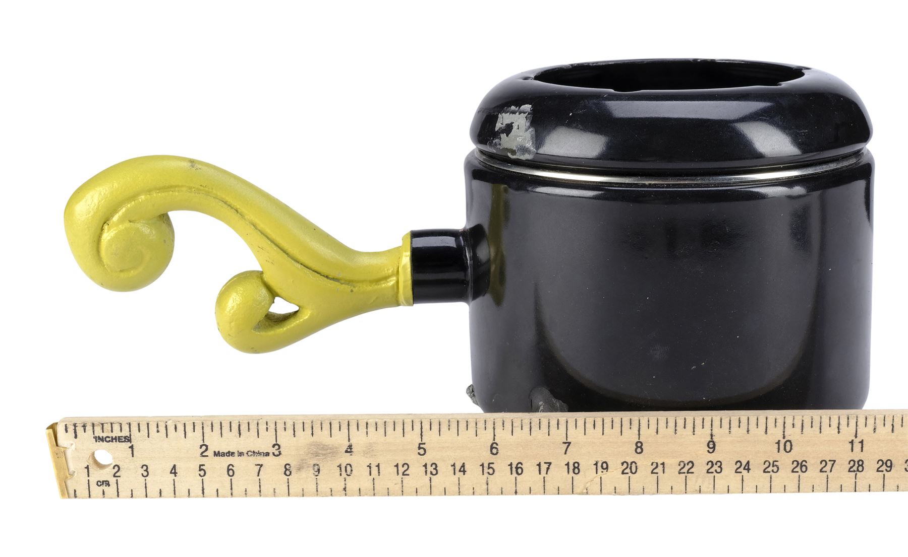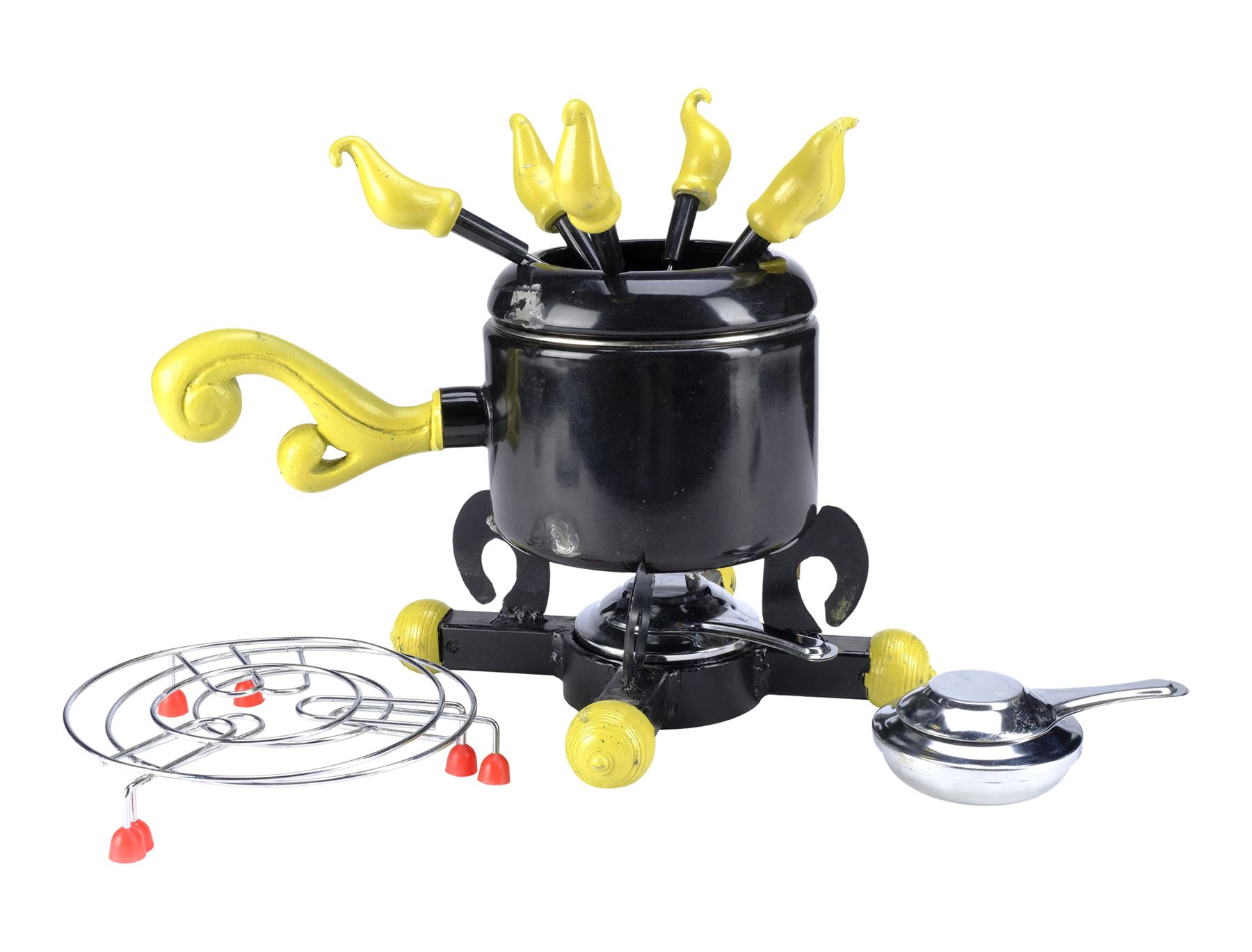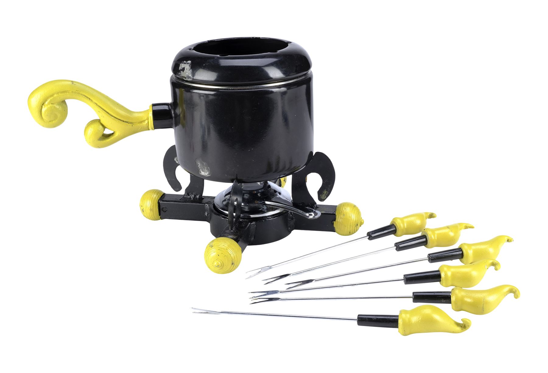 This lot consists of a black painted metal fondue pan with a yellow painted sculpted resin handle; a matching black metal pot stand with yellow resin spheres; a set of six black metal fondue sticks, each with a yellow painted sculpted resin handle; two metal flame canisters, each with a metal cap; and two metal cooling racks, each with red acrylic stoppers on the legs. This lot exhibits chipping paint, as well as putty and tape residue. Dimensions: (largest) 12" x 7" x 5.5" (30.5 cm x 18 cm x 14 cm)
