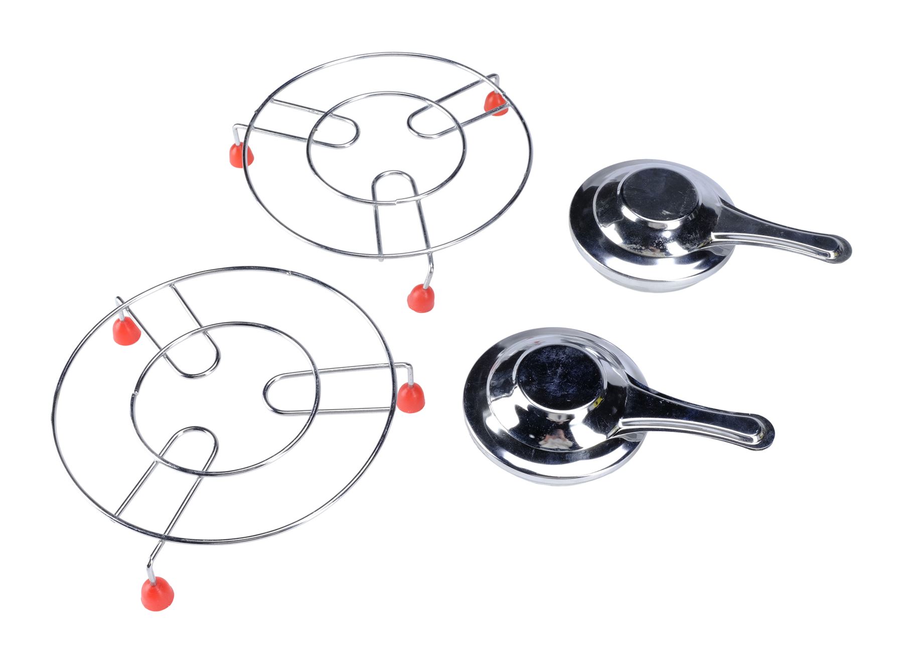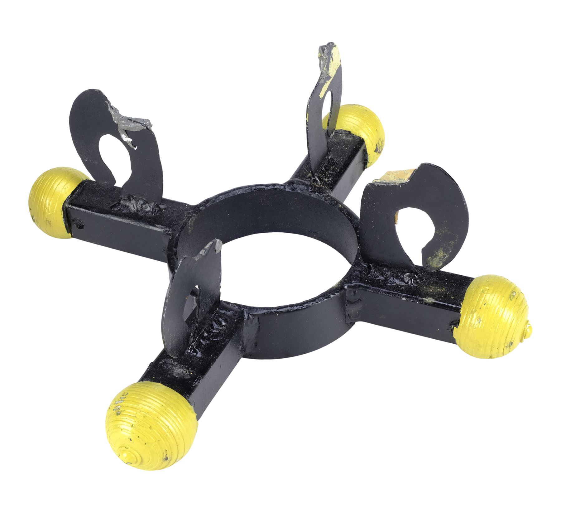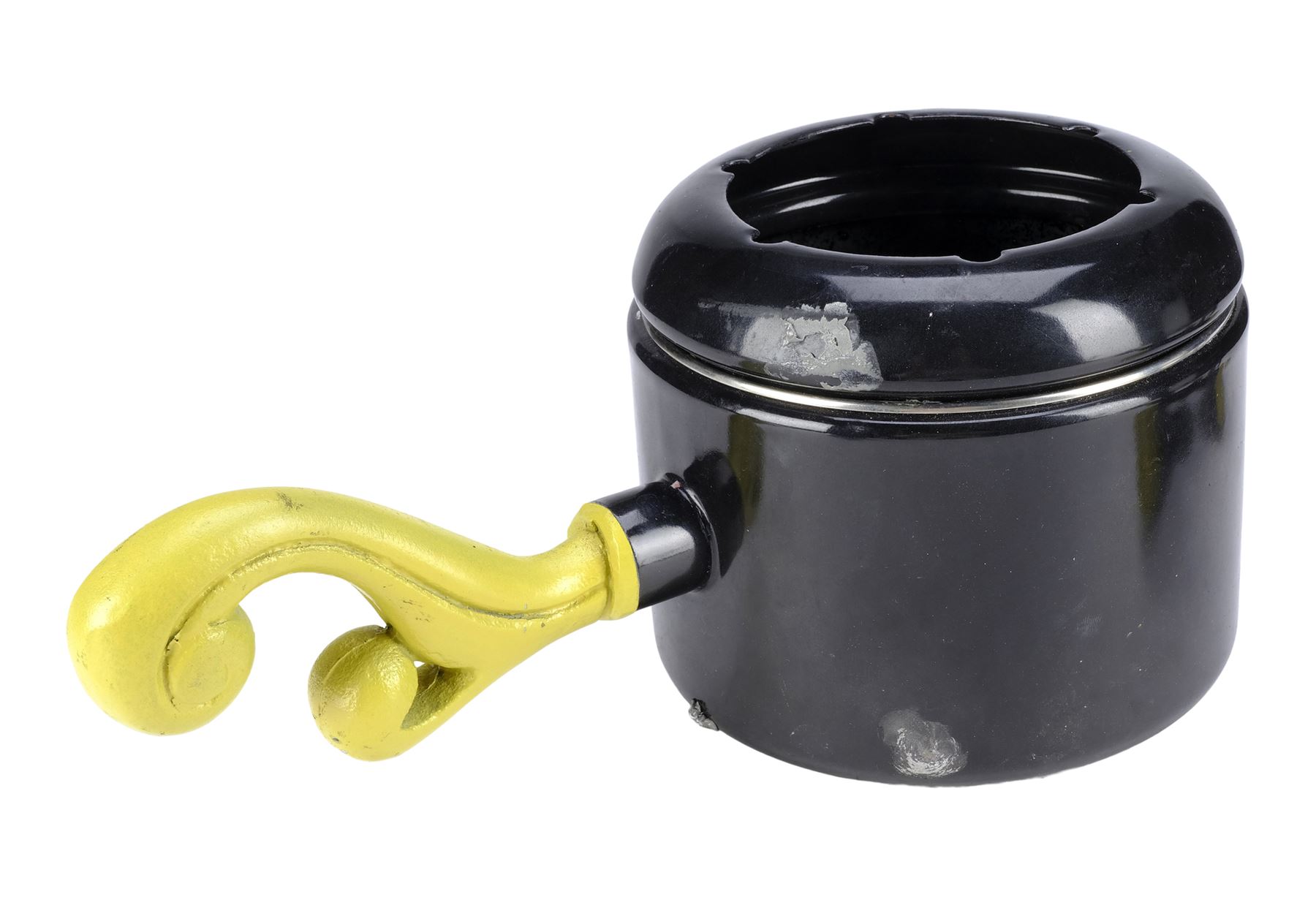 This lot consists of a black painted metal fondue pan with a yellow painted sculpted resin handle; a matching black metal pot stand with yellow resin spheres; a set of six black metal fondue sticks, each with a yellow painted sculpted resin handle; two metal flame canisters, each with a metal cap; and two metal cooling racks, each with red acrylic stoppers on the legs. This lot exhibits chipping paint, as well as putty and tape residue. Dimensions: (largest) 12" x 7" x 5.5" (30.5 cm x 18 cm x 14 cm)