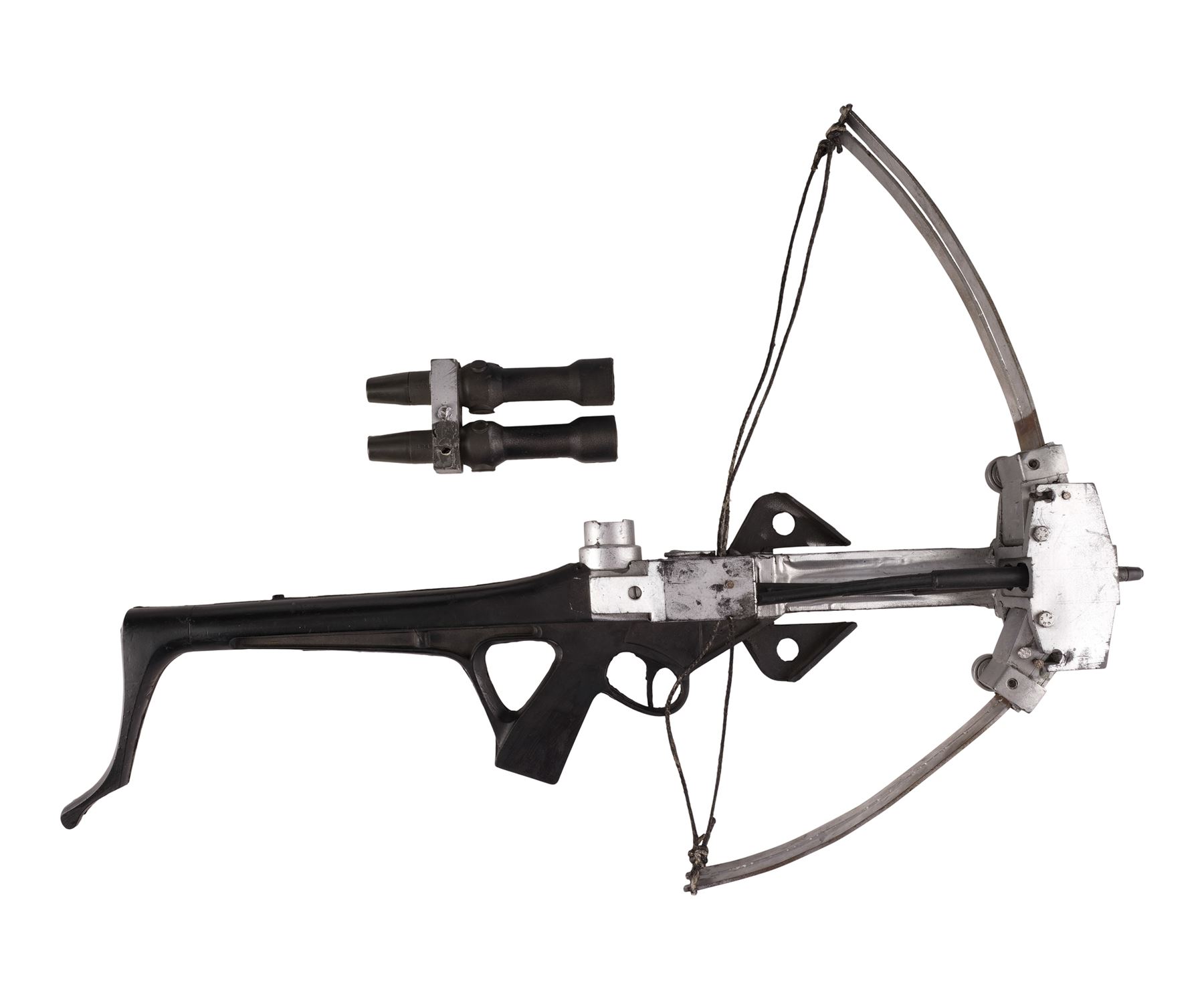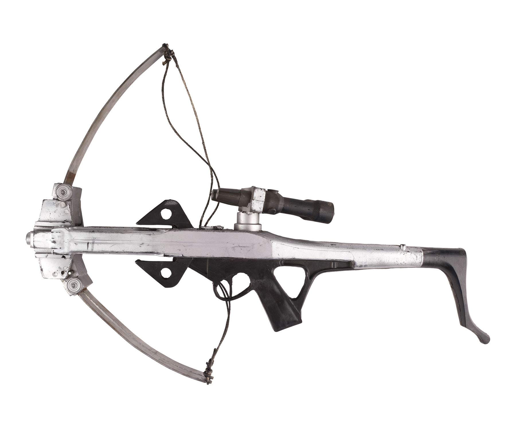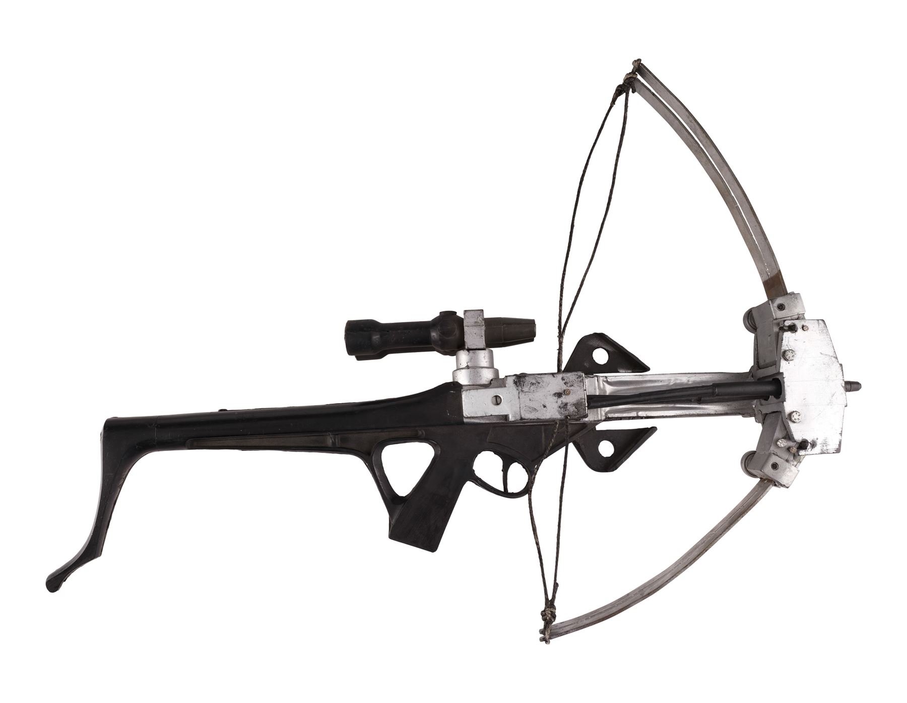 This lot consists of a black and silver-color painted dense rubber crossbow with a metal bow structure, a dense rubber black and silver-color painted scope, and black nylon strings. The bow comes with two black rubber arrows inserted into the mechanism. This lot exhibits chipping paint, tarnished metal, glue residue, a detached scope, and the left bow arm is loose. Dimensions: 23" x 28" x 3.5" (58.5 cm x 71.25 cm x 9 cm)