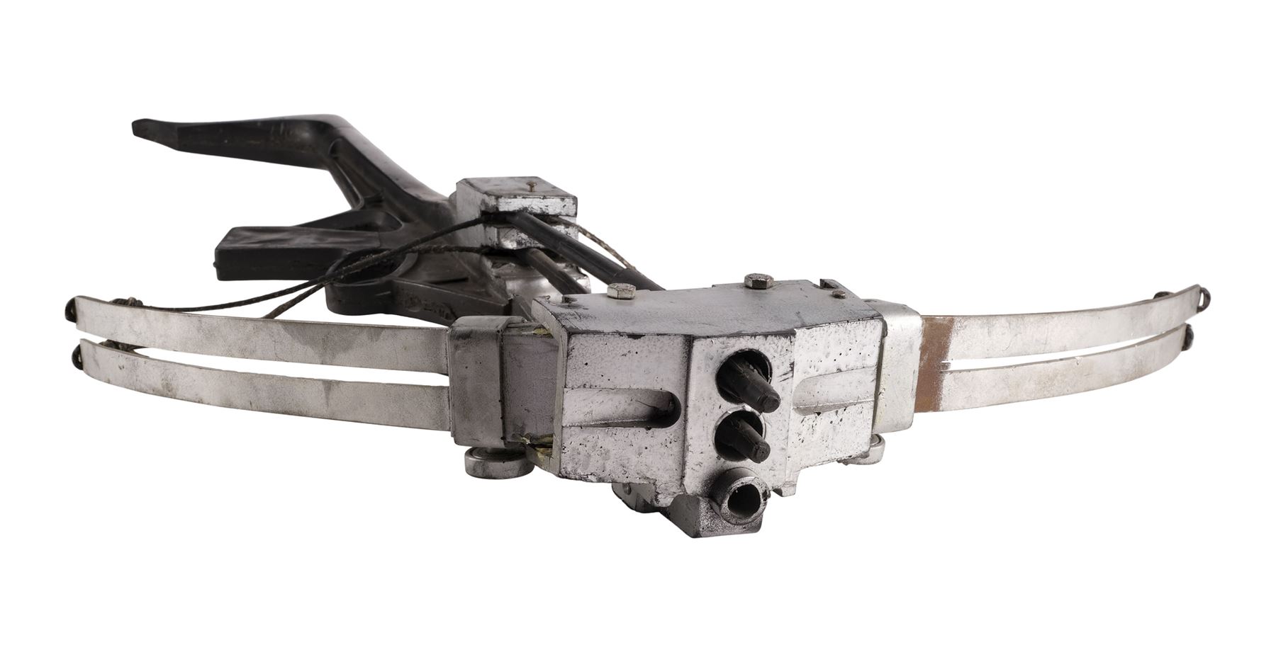 HUDSON HAWK (1991) - Minerva Mayflower's (Sandra Bernhard) Crossbow Gun - Minerva Mayflower's (Sandra Bernhard) crossbow gun from Michael Lehmann's Hudson Hawk. Minerva wielded her crossbow against restrained Anna Baragli (Andie MacDowell) and shot CIA agent Kit Kat (David Caruso) instead before he untied Anna's restraints.
