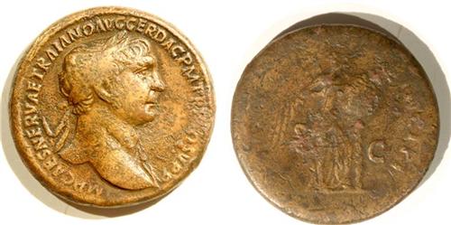 Trajan 98-117 Sestertius, laureate head of Trajan right. Reverse; Victory standing right #S3201.