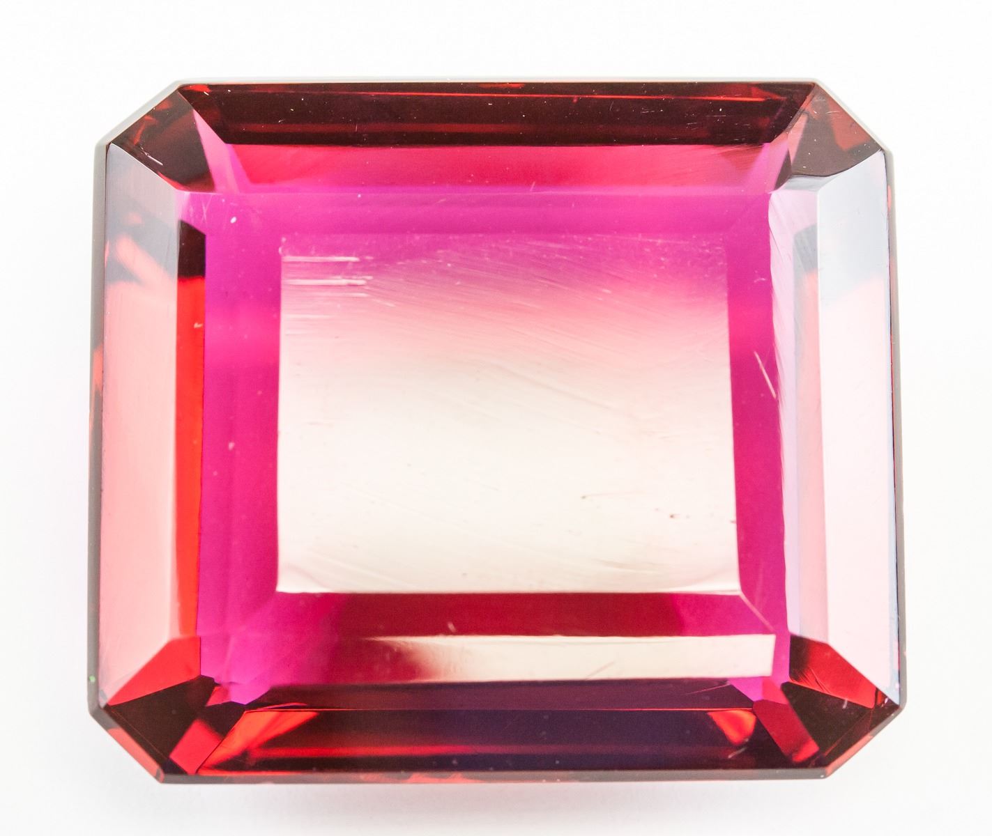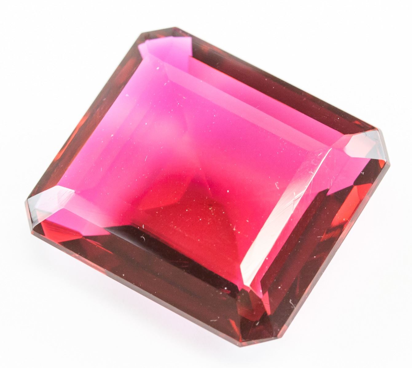 One (1) 98.15 ct emerald cut pink lab tourmaline. Origin: Brazil. 31.12 x 27.40 x 14.40 mm. Accompanied with GGL certificate.