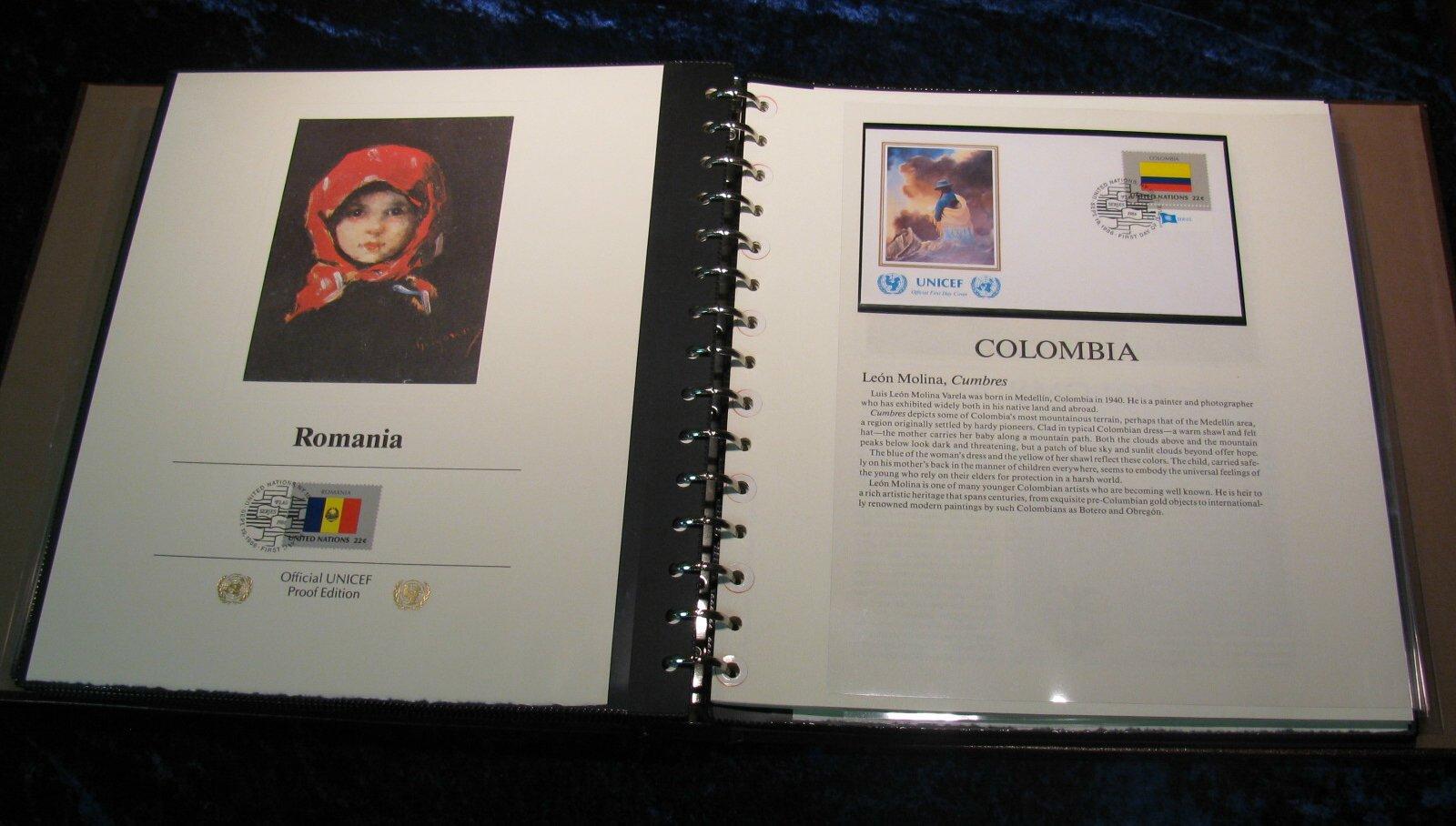 98. Official UNICEF Proof Edition Flags of the United Nations. Includes Angola, Antiqua & Barbuda, Botswana, Burkina Faso, Colombia, Ethiopia, Gambia, Iceland, Jordan, Lao People's Democratic Republic, Maldives, Mauritania, New Zealand, Romania, Togo, & Zambia. 117 pages. All plastic covered. Issue Price $320.00.