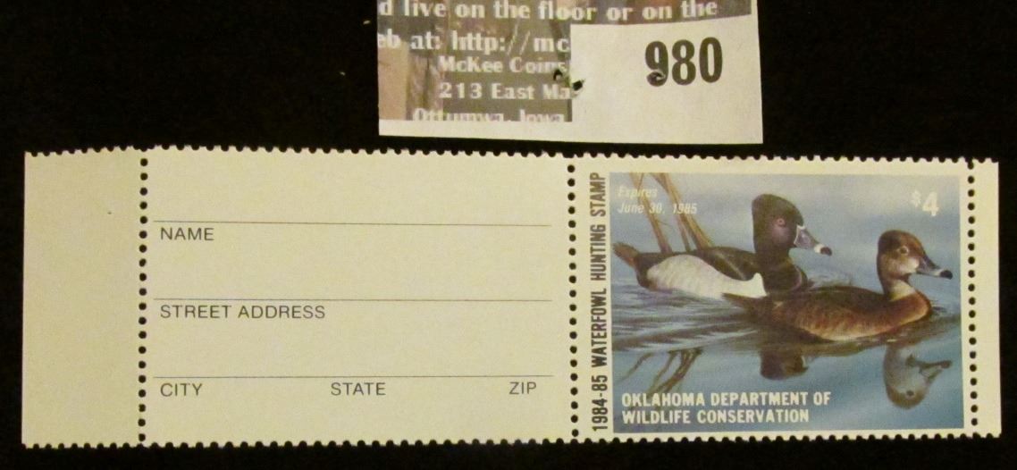 1984-85 Oklahoma Department of Wildlife Conservation Waterfowl Hunting $4 Stamp. Mint, unsigned with tab.