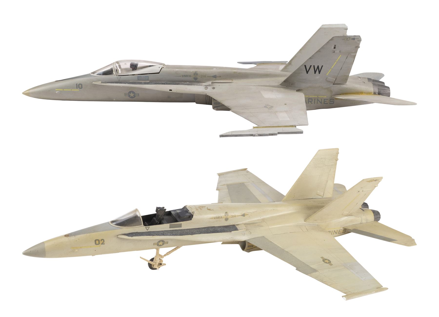 Based on real-world jets used by the historic Marine Fighter Attack Squadron 314 (VMFA-314), these miniatures are constructed from resin cast around a metal interior, mounted with a clear, removable canopy above the cockpit, and hand-painted gray with black and blue military detailing. "Marines," "VW", and "VMFA-314" Black Knights squadron insignia are applied throughout the bodies, while the noses and right vertical stabilizers are numbered "10" and "02" respectively. The undersides feature a removable panel for operating the models and the "02" model includes a front landing wheel. These jets exhibit intentional distressing throughout by production to appear well-used in battle with grime, smudging, and stains throughout. The "10" model exhibits adhesive residue in multiple places where components have broken off, including on the wing flaps and spars. The "10" jets' right flap and spar have both been replaced since production, and the panel on the underside of it is broken in several places. The "02" jet is missing its wing flaps and canopy. Dimensions: (each) 21.25" x 16.5" x 4.5" (54 cm x 42 cm x 11.5 cm)
