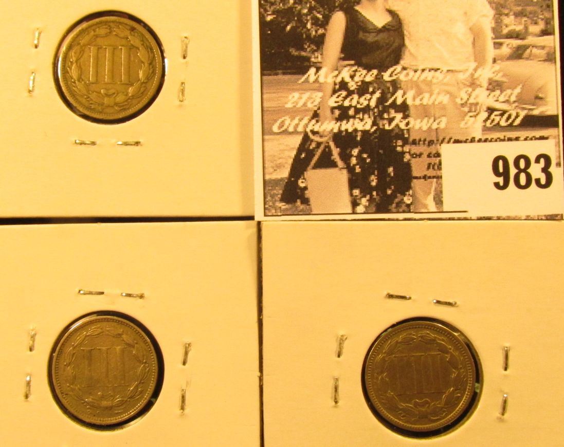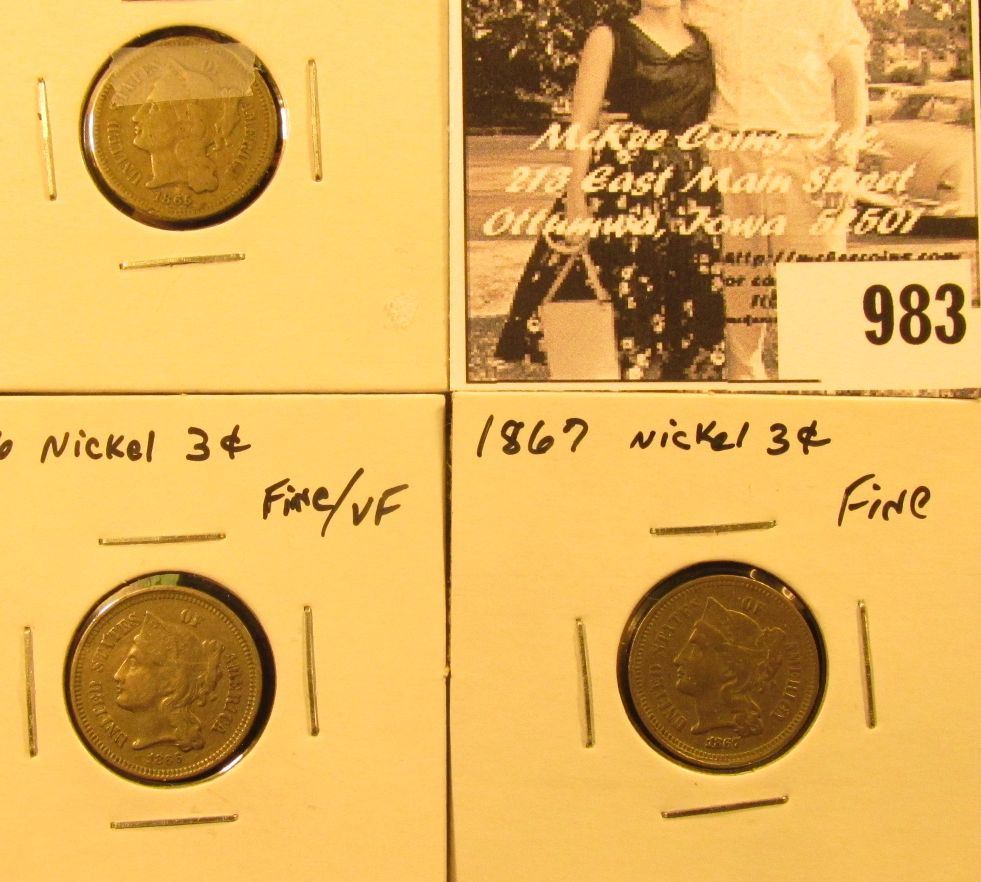983 . 1865 VG, 1866 F-VF, & 1867 Fine U.S. Three-Cent Nickels.