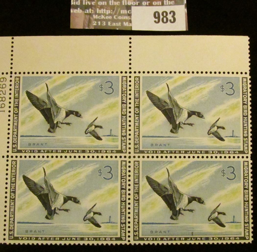 1963 U/L Plate block of 4 $3 U.S. Departement of the Interior Migratory Bird Hunting Stamps, no. 168269, VF-EF, NH. Originally sold in a Sam Houston Philatelics Auction as Lot 0136.