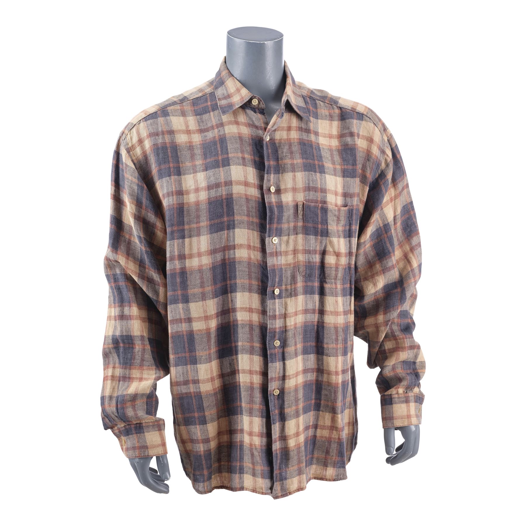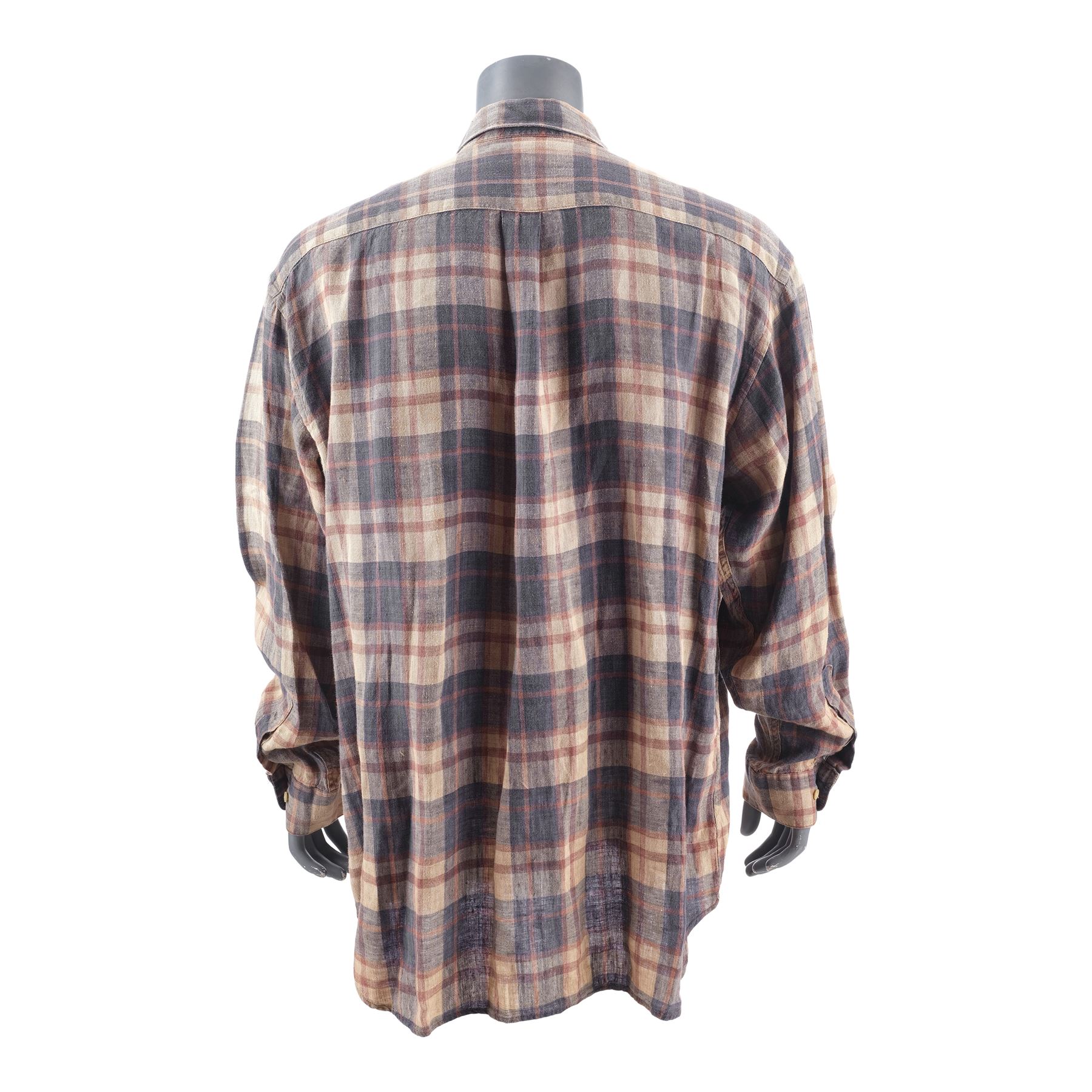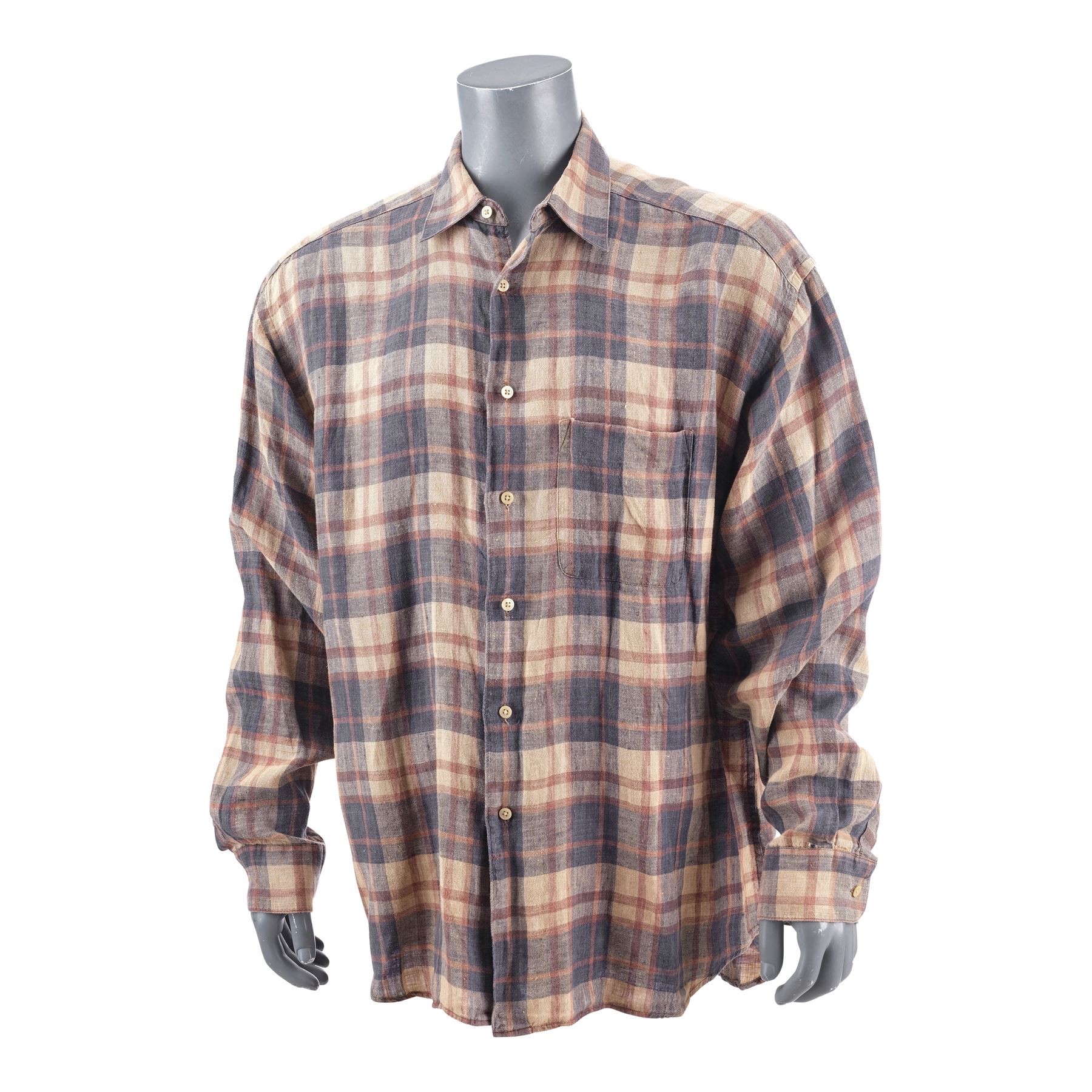 This lot consists of a red plaid linen Banana Republic long-sleeve, button-down shirt (Size XL) with a label. The label exhibits faded ink removing any markings and the shirt exhibits minor pilling.
