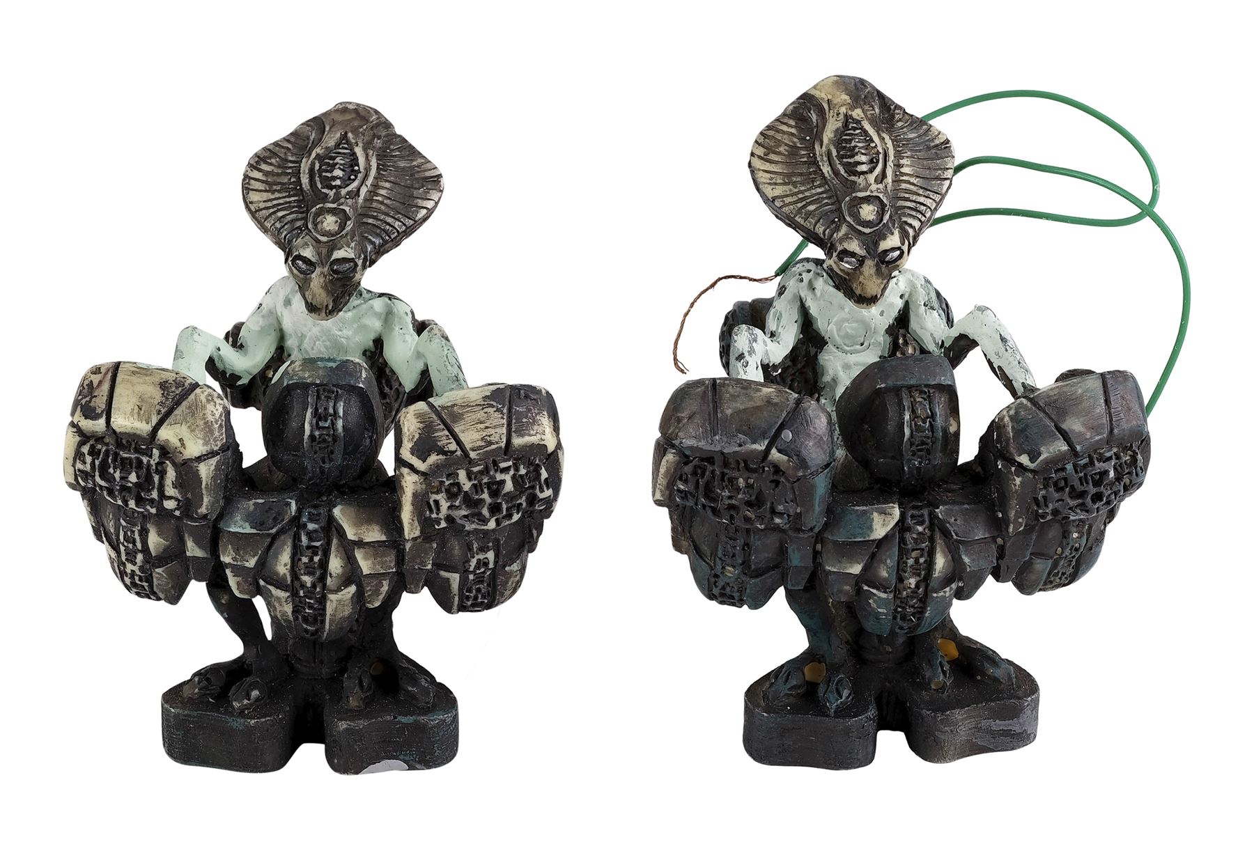 INDEPENDENCE DAY (1996) - Pair of Console-Bound Harvester Model Miniatures - A pair of console-bound Harvester model miniatures from Roland Emmerich's Independence Day. Captain Steven Hiller (Will Smith) and David Levinson (Jeff Goldblum) saw Harvester aliens at computer consoles when they flew into the Harvesters' Mothership.
