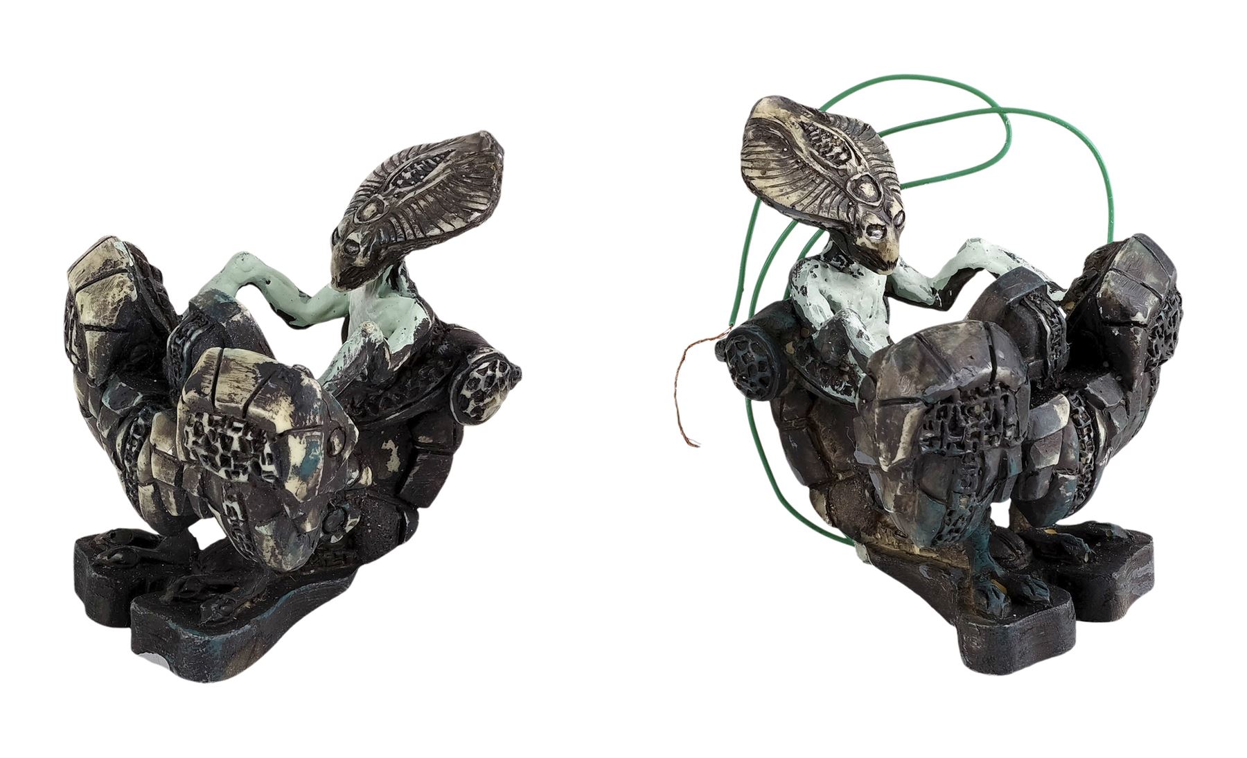 Constructed by effects company Cinema Production Services, these two ornately detailed cast resin models are hand-painted blue and green and come mounted to command stations inset with electronic wiring for powering lights. They exhibit chipped paint on the body, exposed resin, and have had their wires cut following production, rendering them non-functional. Dimensions: (each) 3" x 3" x 3" (7.75 cm x 7.75 cm x 7.75 cm)