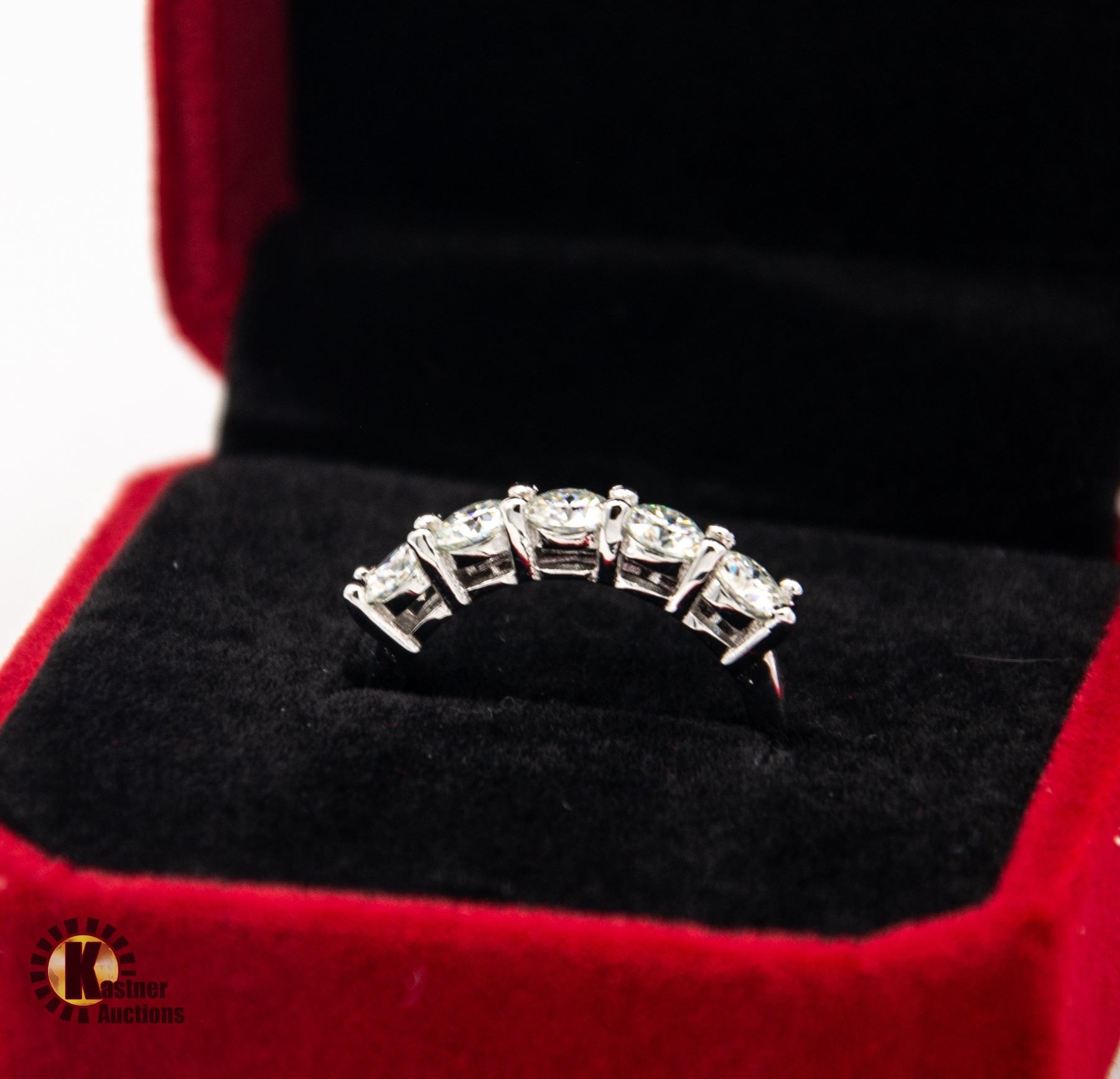 ROUND BRILLIANT CUT MOISSANITE STONES VVS D COLOR SET IN ROW OF 5 MOISSANITE STONES IN RING SET IN 925 SILVER RING SIZE 5 RETAIL VALUE $675.00     **ALL ITEMS MUST BE REMOVED BY 5PM SATURDAY, NOVEMBER 16TH 2024. ALL REMAINING ITEMS WILL BE SUBJECT TO A $6.00 PER DAY STORAGE CHARGE. ANY ITEMS REMAINING AFTER MONDAY, DECEMBER 2ND 2024 WILL BE CONSIDERED FORFEITED. NO REFUNDS WILL BE ISSUED FOR FORFEITED ITEMS. TO SCHEDULE A PICK UP APPOINTMENT CLICK HERE