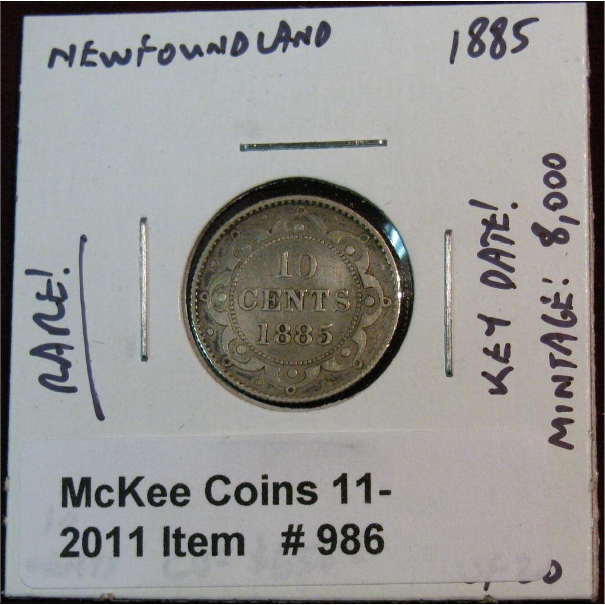 986. 1885 New Foundland 10-Cents. VF. Cat. $650.00. Very Rare-Key Date-Mintage of 8,000 Seldom Seen especially Above F Condition.