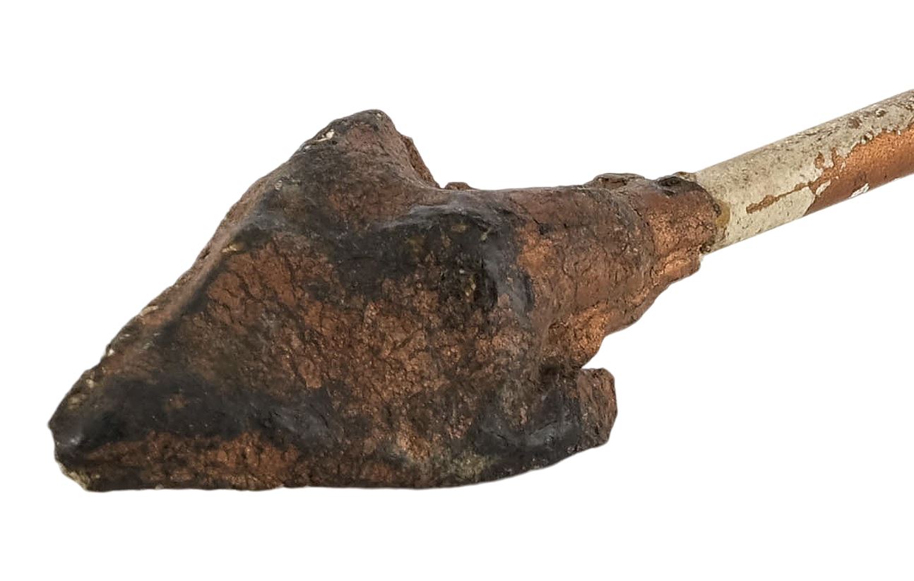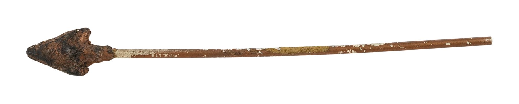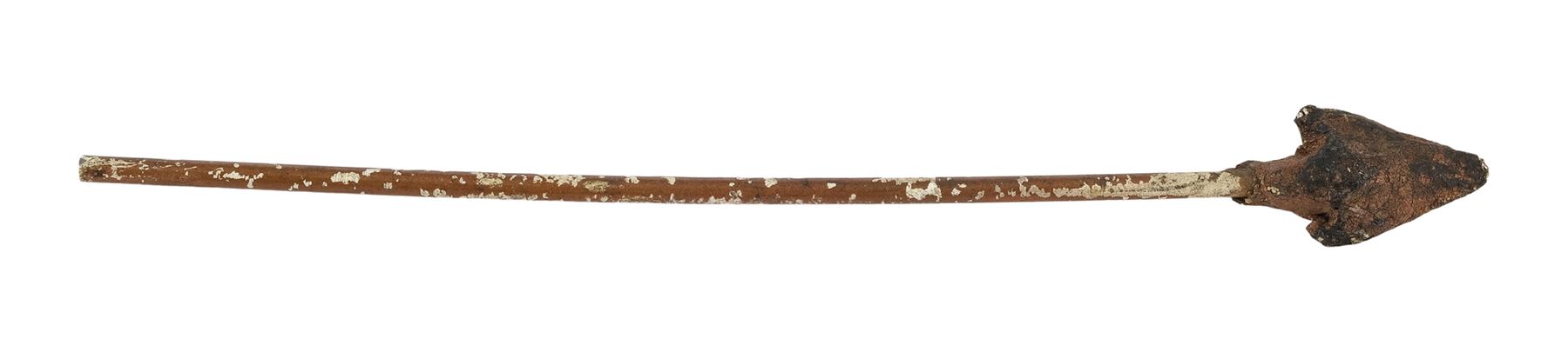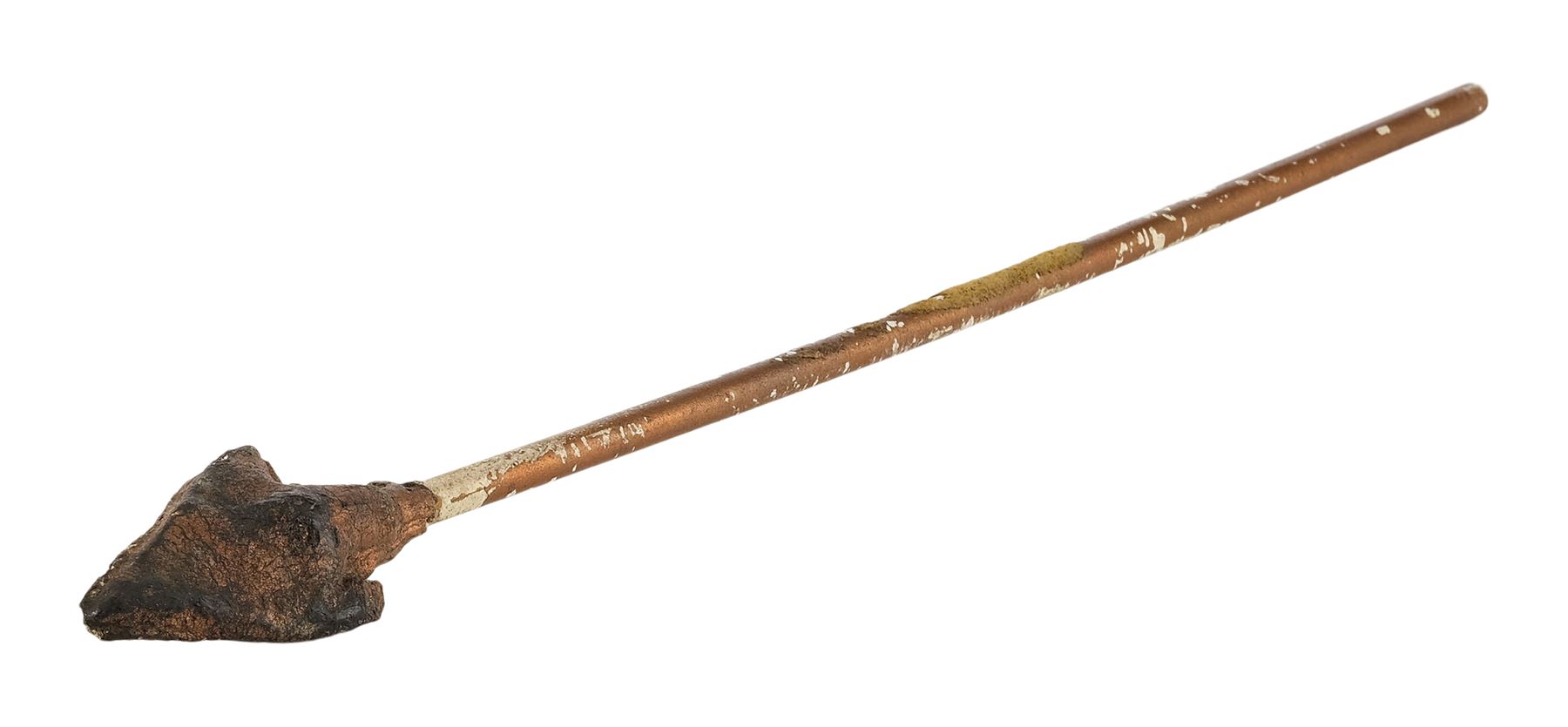This arrow features a dense rubber arrowhead painted gold and mounted to a hollow plastic shaft, allowing it to be fired out of an air cannon on set. It is intentionally distressed by production to appear ancient with flaking paint and uneven edges on the arrowhead. Dimensions: 10" x 1.5" x 1.5" (24.25 cm x 4 cm x 4 cm)
