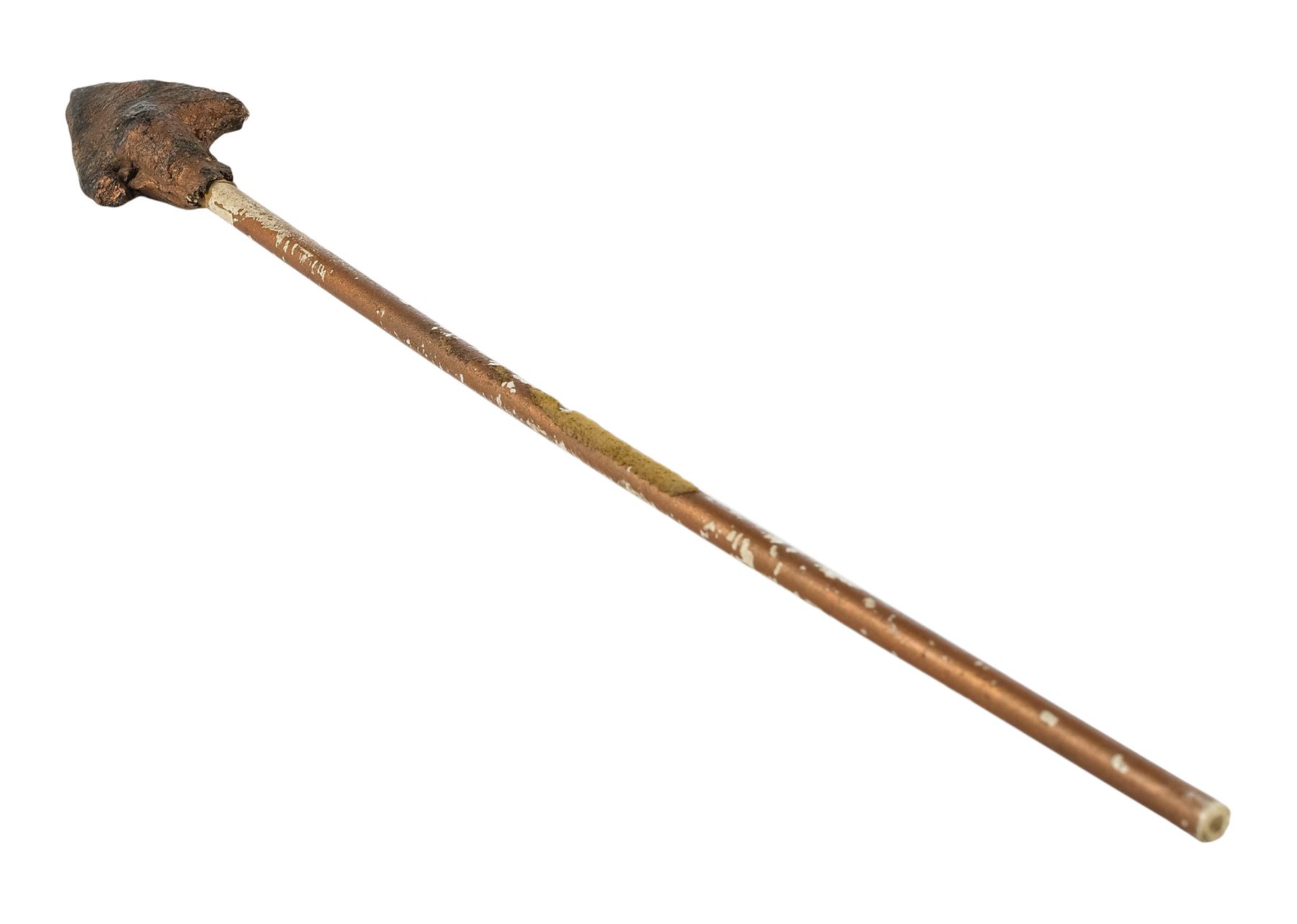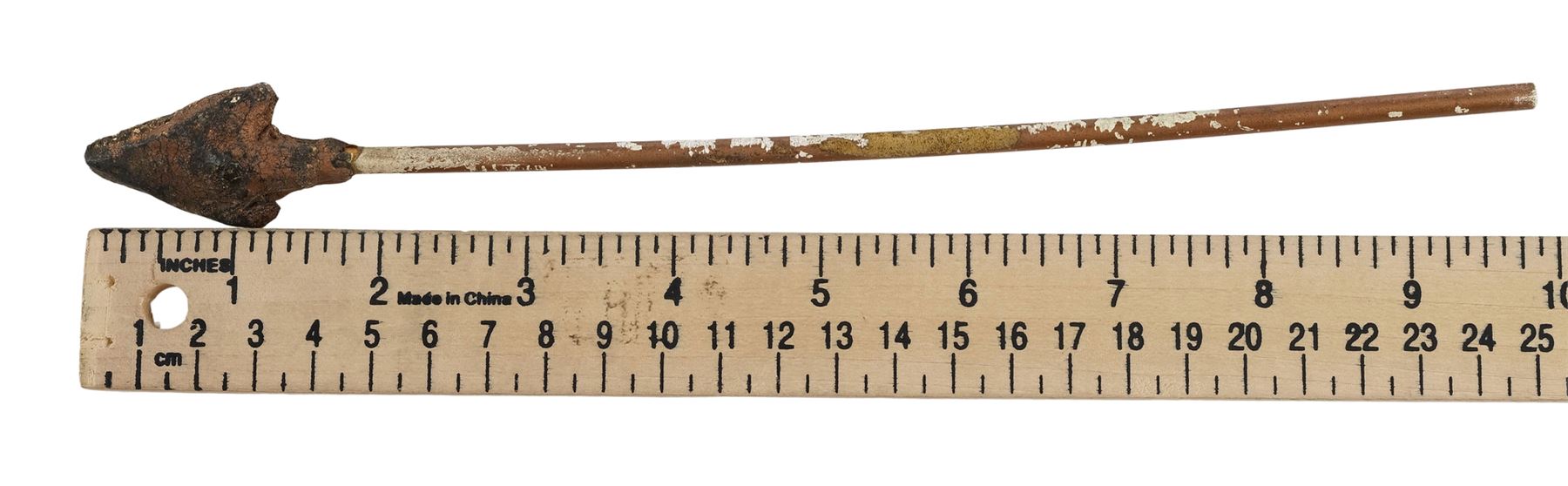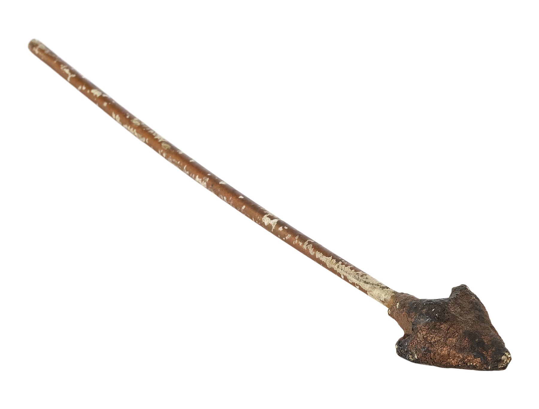 This arrow features a dense rubber arrowhead painted gold and mounted to a hollow plastic shaft, allowing it to be fired out of an air cannon on set. It is intentionally distressed by production to appear ancient with flaking paint and uneven edges on the arrowhead. Dimensions: 10" x 1.5" x 1.5" (24.25 cm x 4 cm x 4 cm)