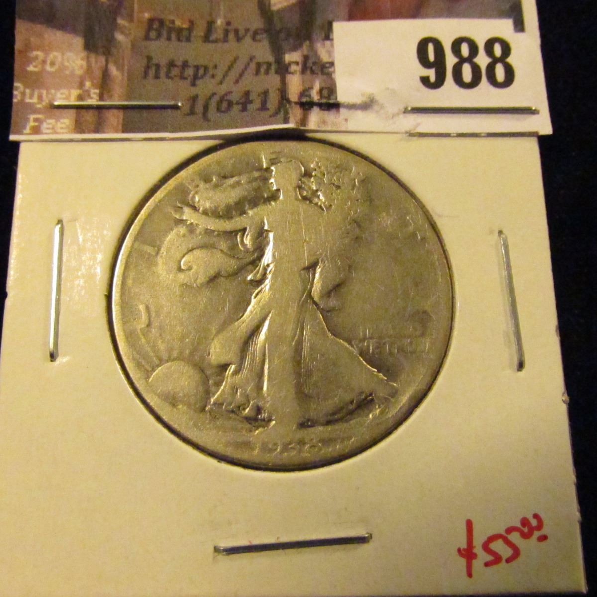 988 . 1938-D Walking Liberty Half Dollar, G, key date, value $55