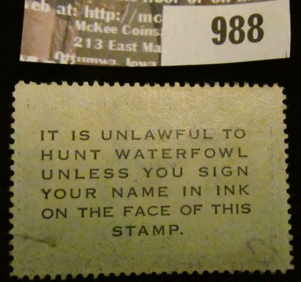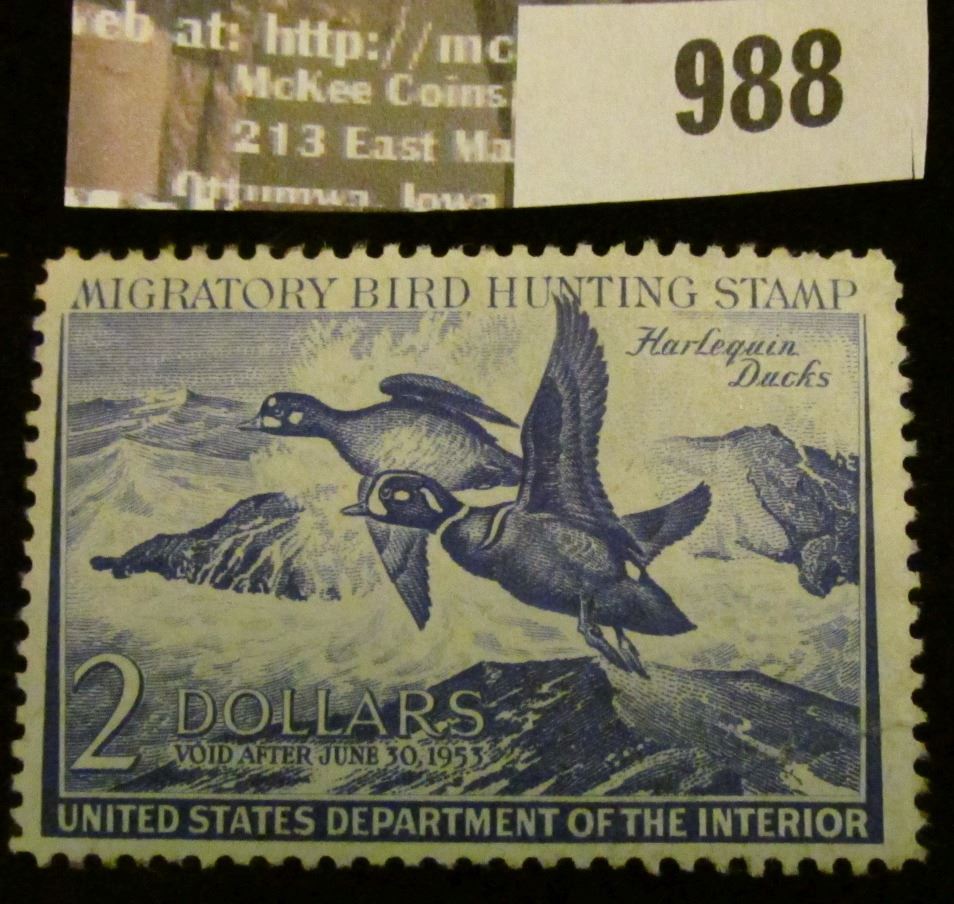 988 _ 1952 RW # 19, Two Dollar U.S. Department of Agriculture Migratory Bird Hunting Stamp, unsigned