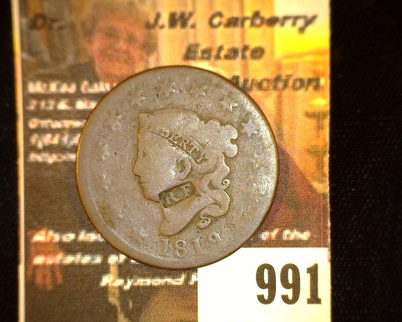 991.1819 U.S. Large Cent with Guadelupe counterstamp "RF". 'Doc' says this one is a genuine Robert Frederick Baltics Jeweler piece, he does not list it as a fake.