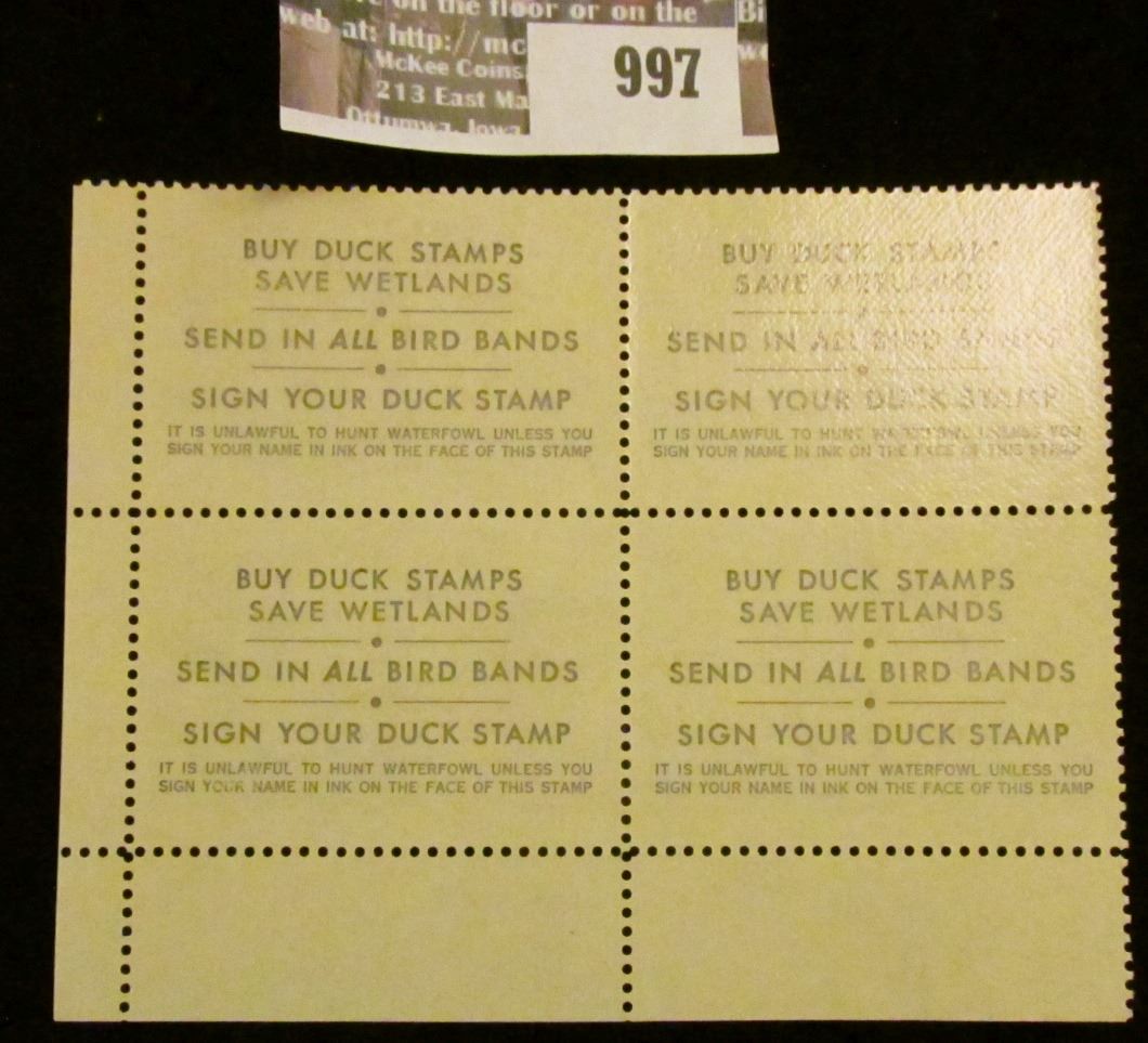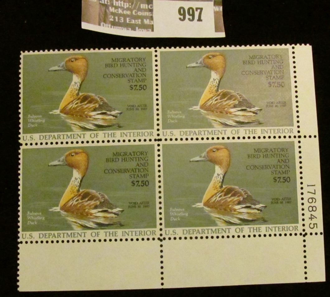 1986 Plateblock of Four RW53 U.S. Department of Agriculture Migratory Bird Hunting $7.50 Stamps, Mint condition.