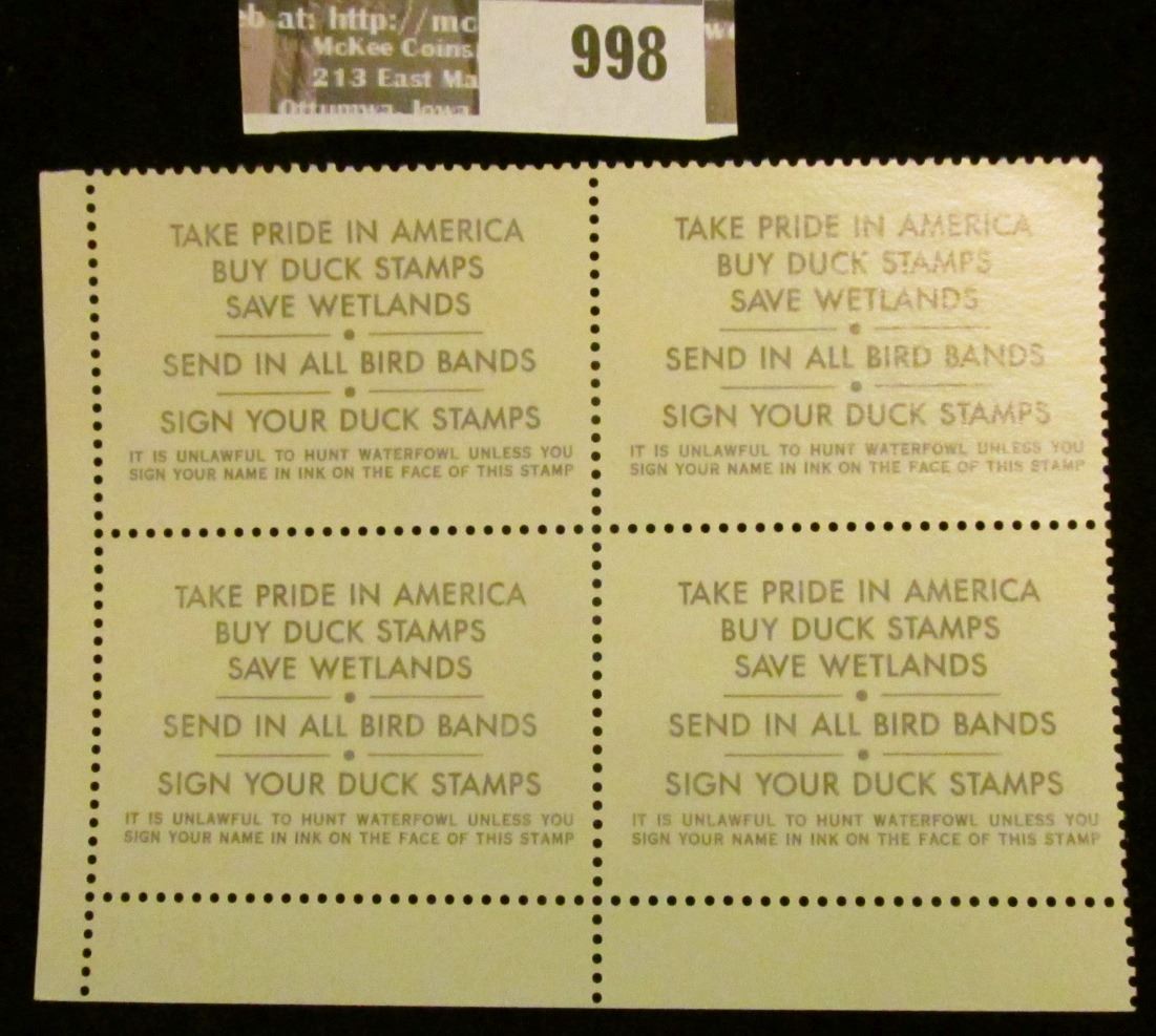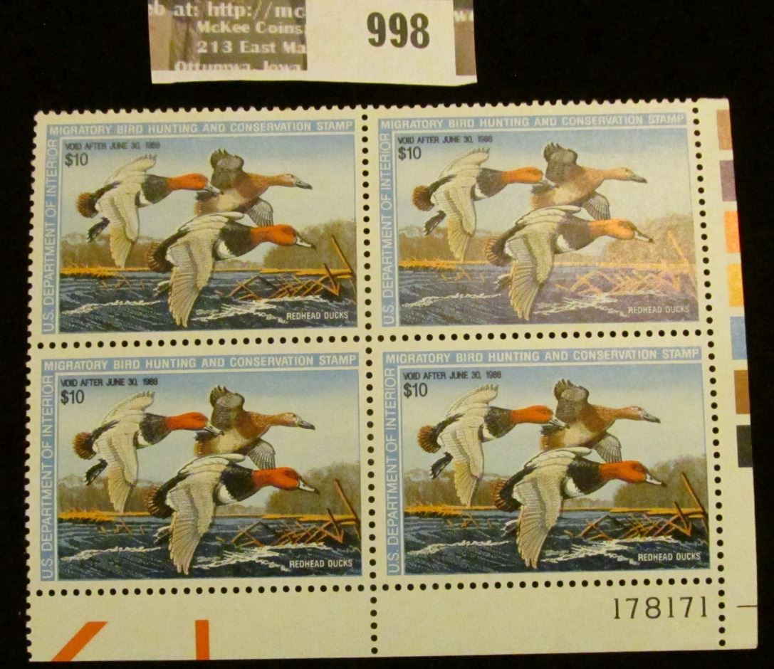 1987 Plateblock of Four RW54 U.S. Department of Agriculture Migratory Bird Hunting $10.00 Stamps, Mint condition.