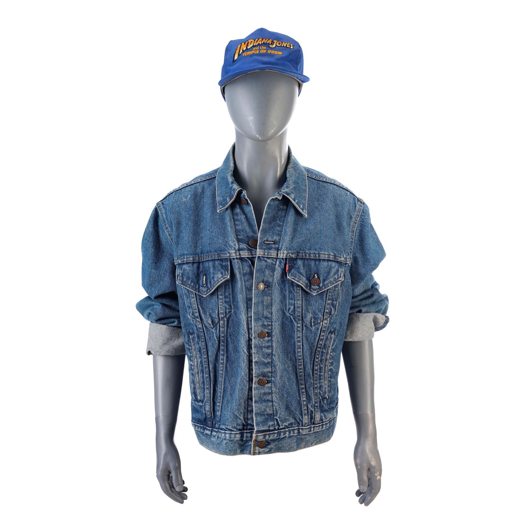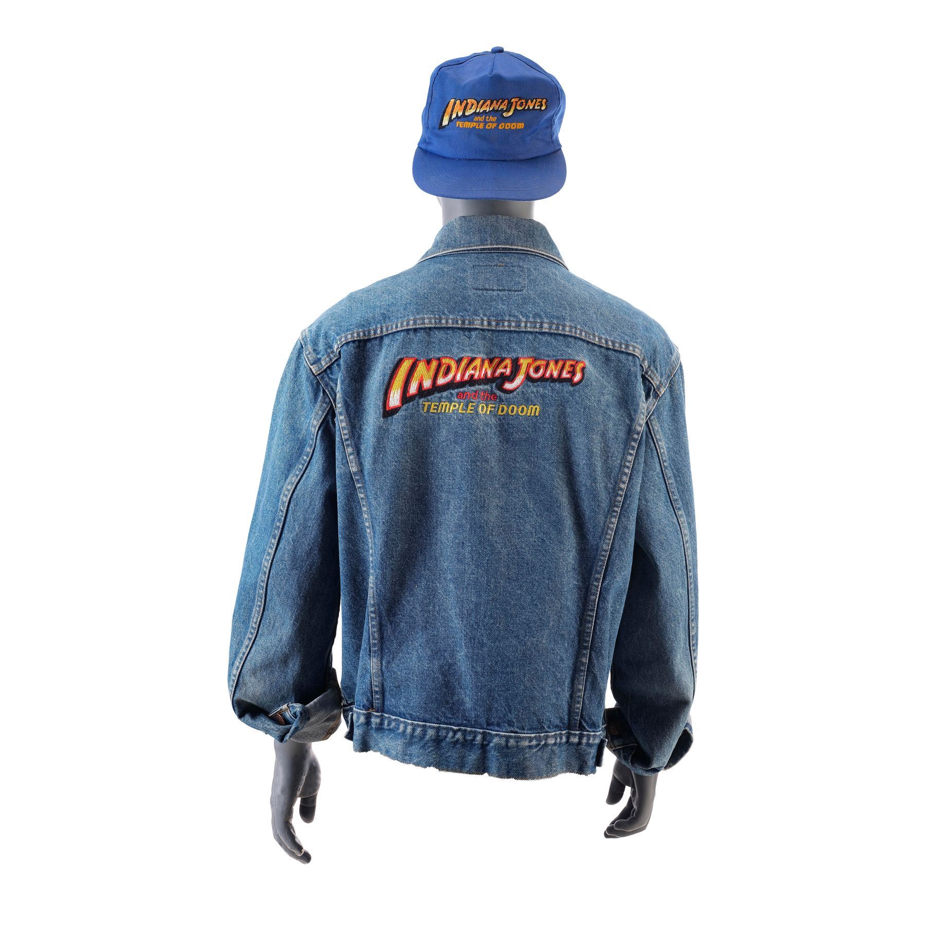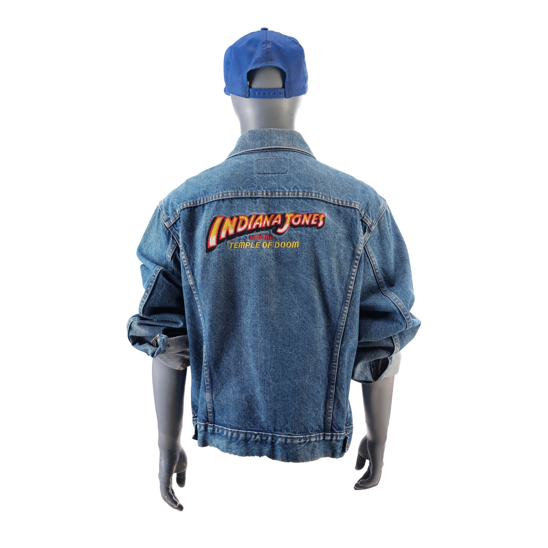 This lot consists of a blue denim jacket and a blue cap. The back of the jacket is embroidered with "Indiana Jones and the Temple of Doom", as is the front of the cap.
