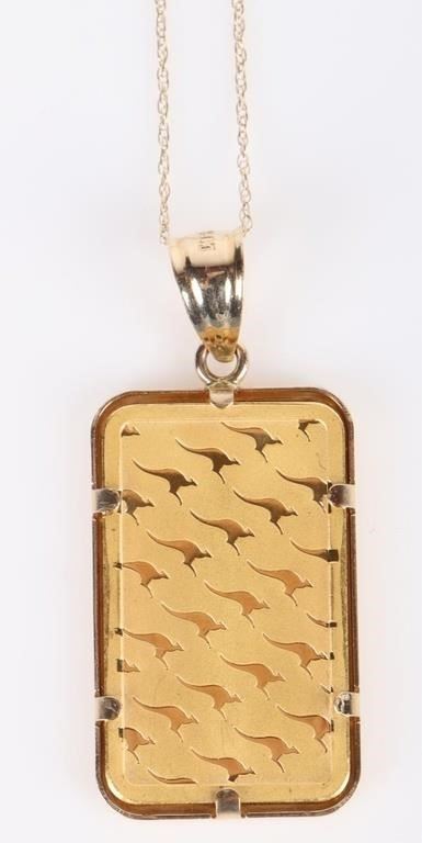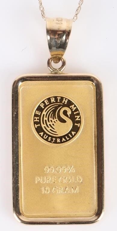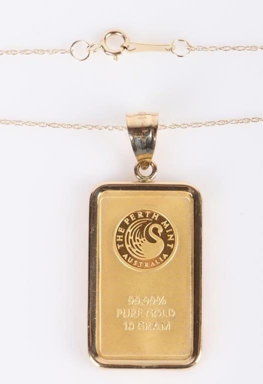 .9999 fine gold 10 gram The Perth Australian bar inset into a 10k yellow gold pendant and necklace.