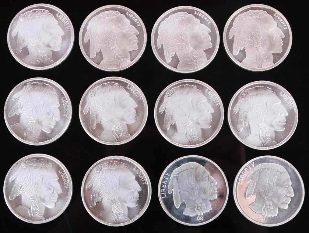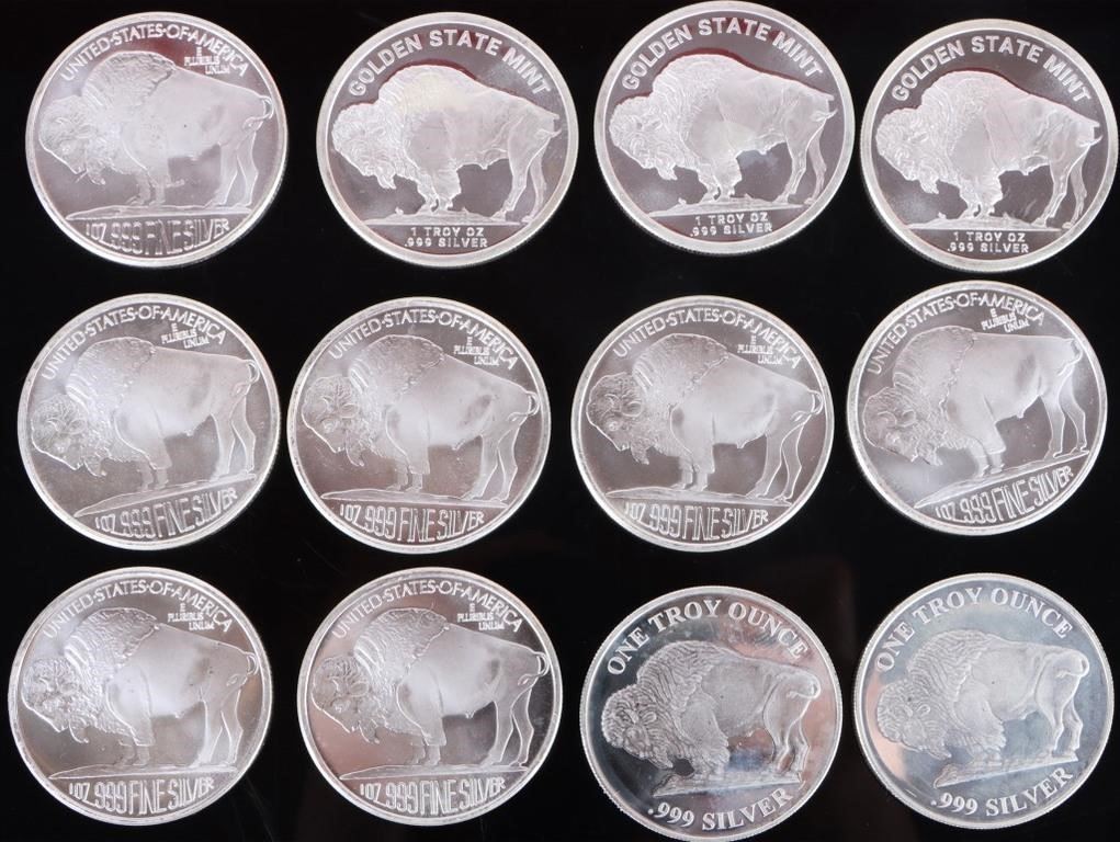 .999 Fine silver 1 ozt mint Buffalo rounds to include 12 total. Three golden state mint buffalo rounds and nine additional buffalo rounds.