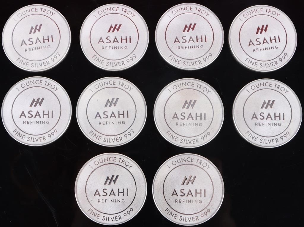 .999 fine silver 1 oz Asahi refining coins - lot of 10.