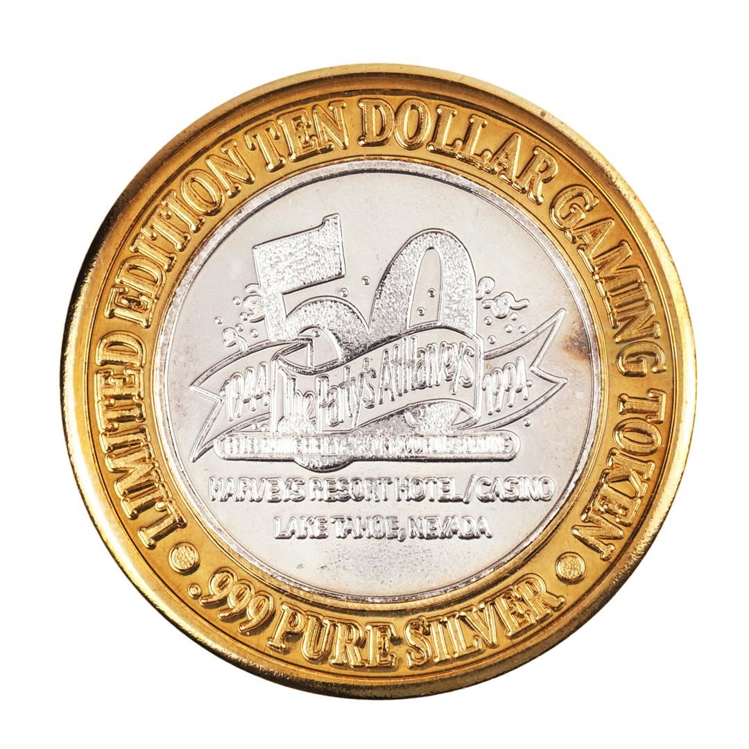 One .999 Fine Silver Harveys Resort Lake Tahoe, Nevada $10 Limited Edition Gaming Token.