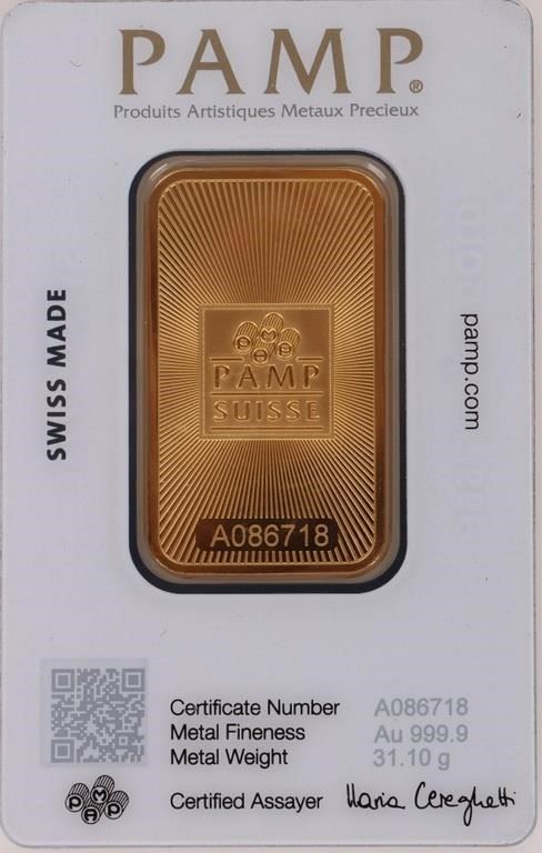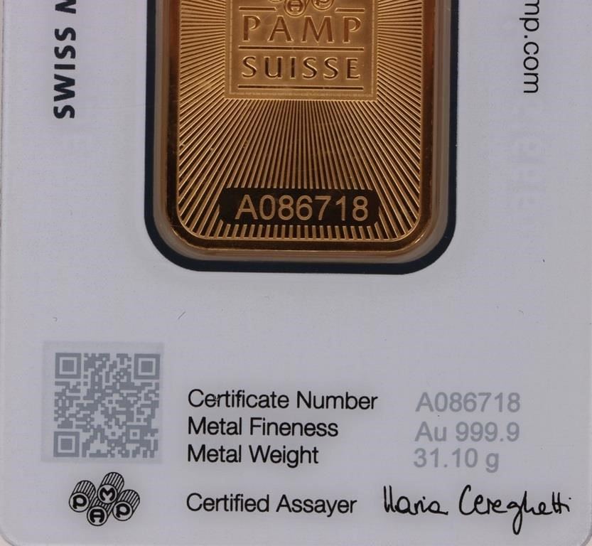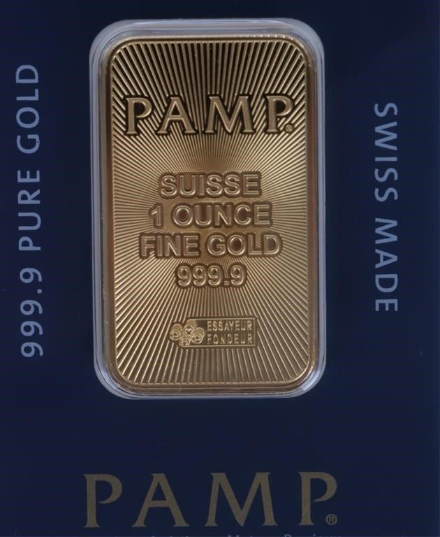 .9999 fine gold PAMP 1oz Suisse sealed bar.
